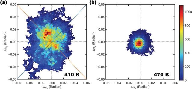 图2.根据有效哈密顿量预测的四方P4/mbm相(a)和立方Pm-3m相(b)40000步蒙特卡罗计算的CsPbI3结构的x,y方向碘八面体转角图。(a)和(b)中的水平和垂直虚线标记ωRx和ωRy的零,而计数的颜色代码(指示直方图中(ωRx,ωRy)的扫掠特定值的数目)显示在右侧,蓝色表示该碘八面体转角的结构的数目很少,红色表示该碘八面体转角的结构的数目很多。