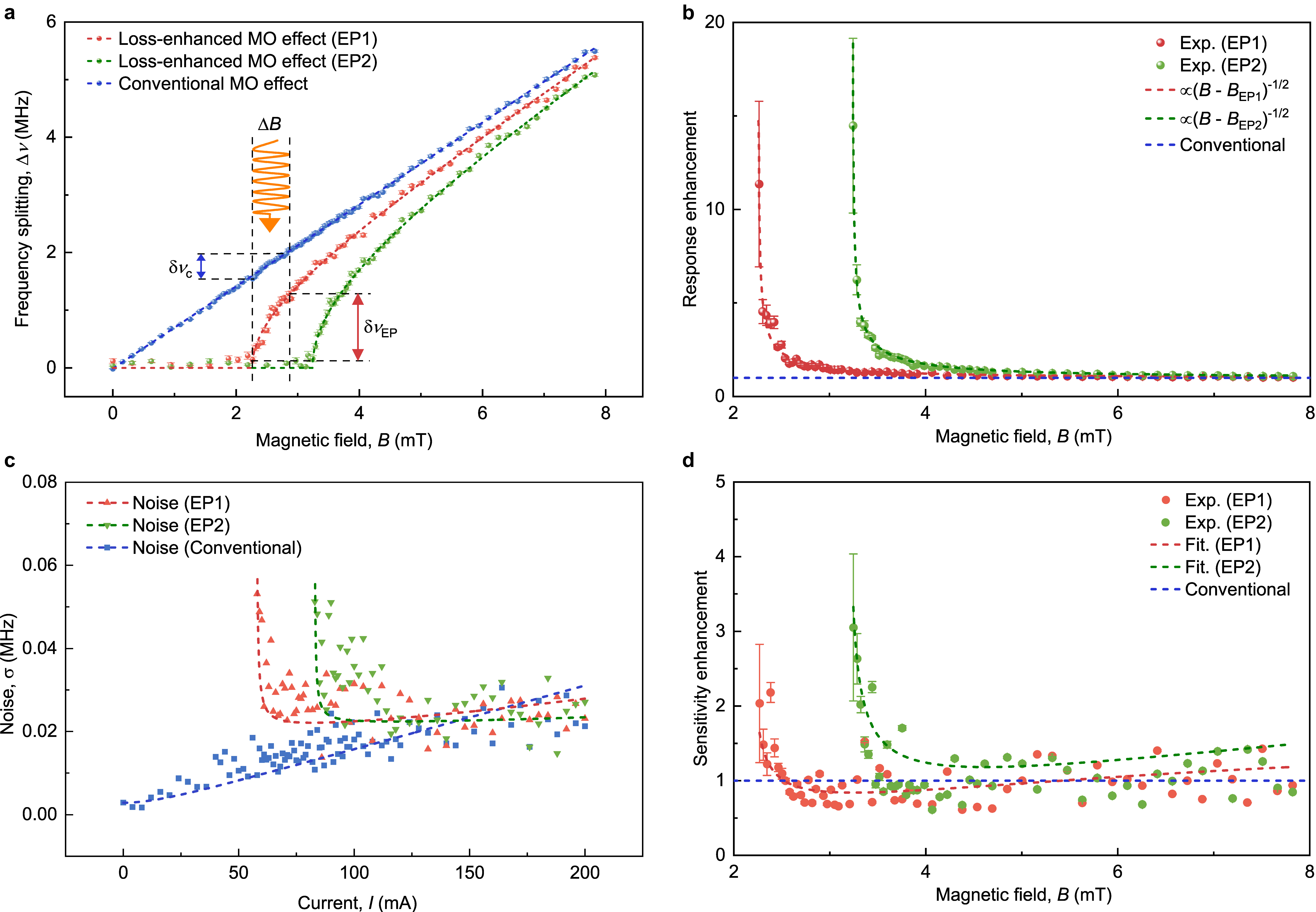 图3 传统厄米和非厄米增强磁传感的实验观测。(a) 磁场作用下两种磁传感器的特征频率分裂。实心点和虚线分别表示实验结果和拟合结果。(b) 与传统厄米磁传感器相比,非厄米磁传感器中响应度的增强因子。(c) 两种磁传感器的实验测量误差。(d) 非厄米磁传感器的灵敏度增强因子。