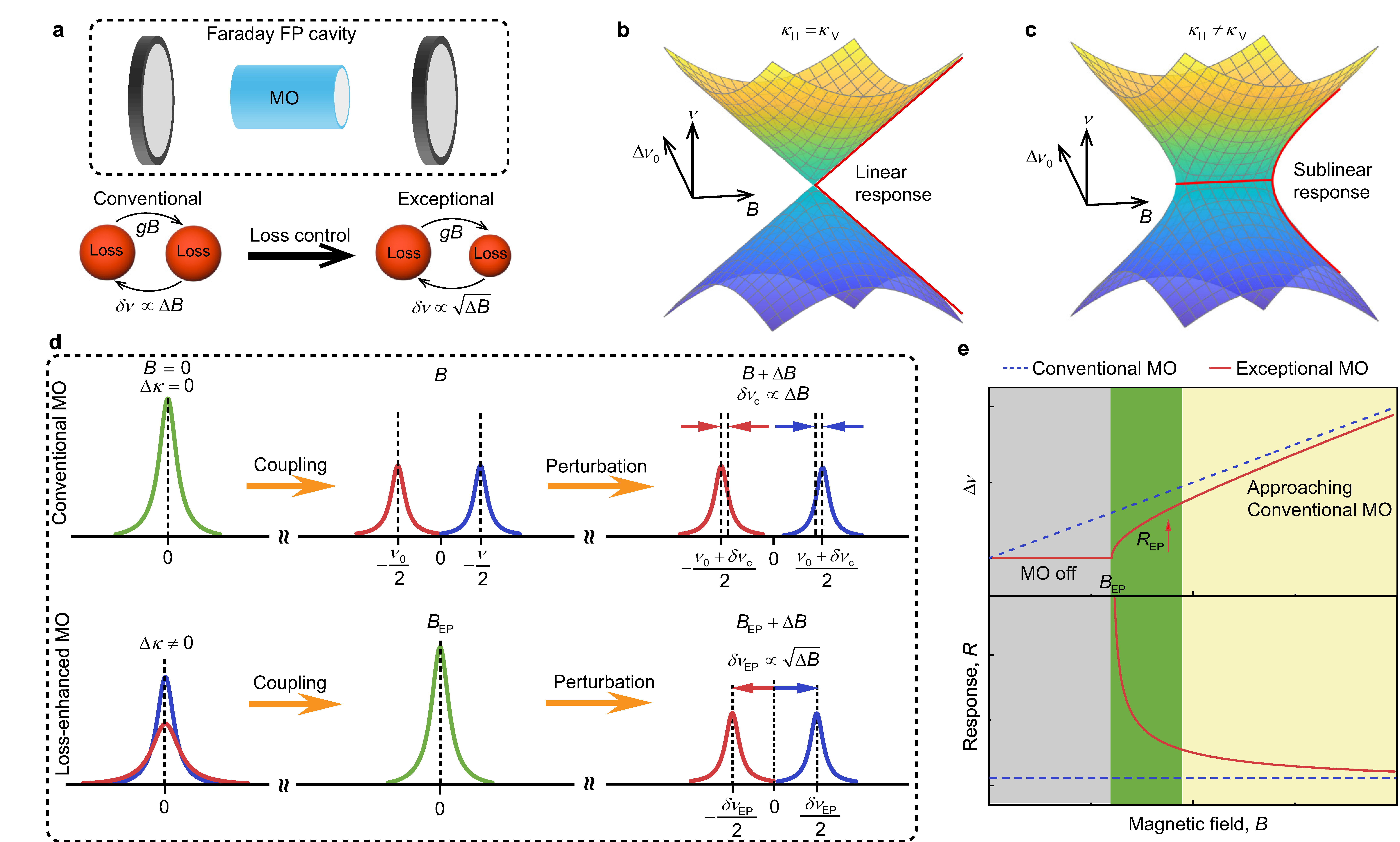 磁光效应在电磁学和量子力学中至关重要,在光学中广泛应用于传感、非互易器件、自旋电子学、二维材料的磁学、量子计算,甚至识别基本物理效应。迄今为止,它们大多局限于传统的磁光法拉第效应(MO Faraday effect)和克尔效应(Kerr effect)。迄今为止,非厄米系统中的磁光效应一直难以捉摸。非厄米物理在各种玻色子甚至量子系统中已经广泛研究,与磁性相关的非厄米系统,如磁波导和腔体以及量子自旋,已被提出用于揭示奇异的物理现象。在这些现象中,特殊的奇点称为奇异点(exceptional point),由于本征值和本征向量的同时简并而引起了广泛关注。奇异点的存在使得系统的谐振频率对外界扰动的敏感性显著提高,这种特性已在光子学和电子学中催生了增强传感的概念。尽管已有研究表明,非厄米系统在奇异点附近可以显著提高传感器的响应能力,但其能否有效提高信噪性能(即灵敏度)仍存在理论争议,并且实验验证也相对不足,现有实验大多集中于有源的增益-耗散型非厄米系统,主要展示了响应的增强,而缺乏灵敏度提升的具体实验证据。