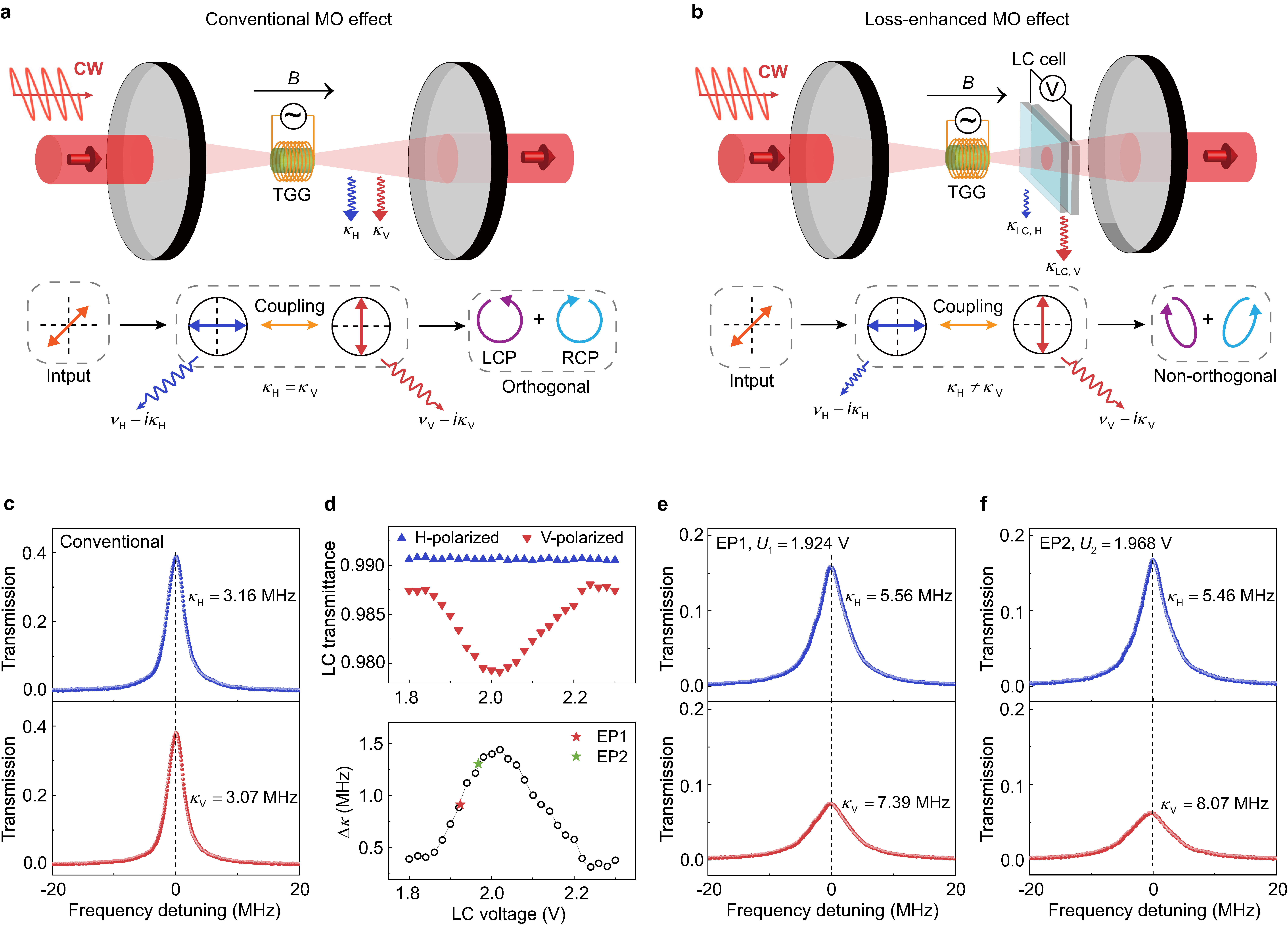 图2 (a, b) 传统厄米和非厄米磁传感器的实验装置图。(c) 厄米体系中水平和竖直线偏振模式的腔透射谱。(d) 水平与竖直偏振模式在液晶中的透过率以及在腔中的损耗。(e, f) 非厄米 中水平和竖直线偏振模式的腔透射谱,(e)对应EP1, (f)对应EP2。