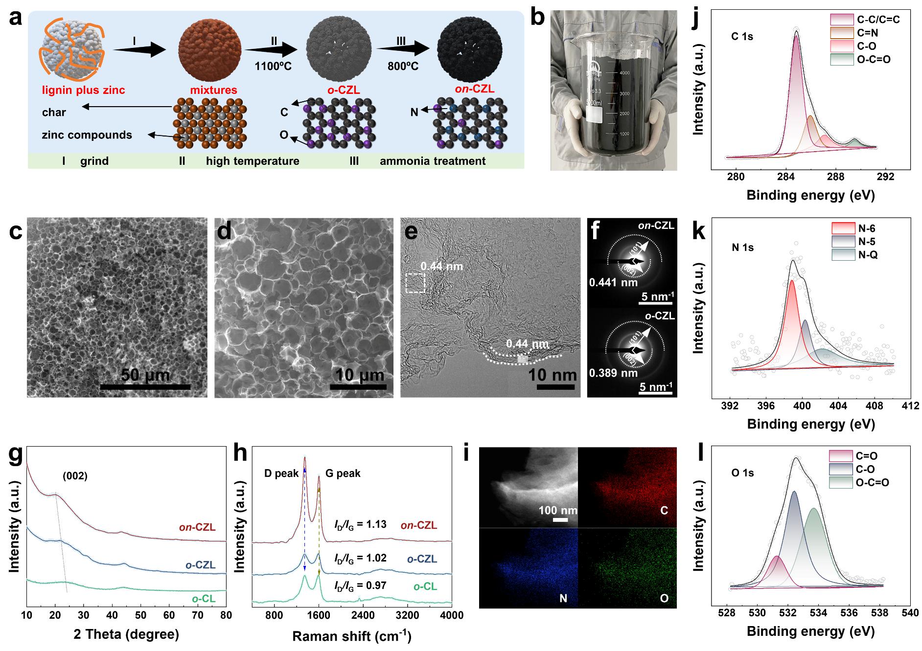 图1.on-CZL碳材料表征。(a)锌辅助热裂解木质素合成on-CZL的示意图;(b)on-CZL材料;(c,d)SEM图;(e)HRTEM图;(f)SAED图;(g,h)XRD图和Raman光谱(i)EDS元素分布图;(j-l)XPS谱。