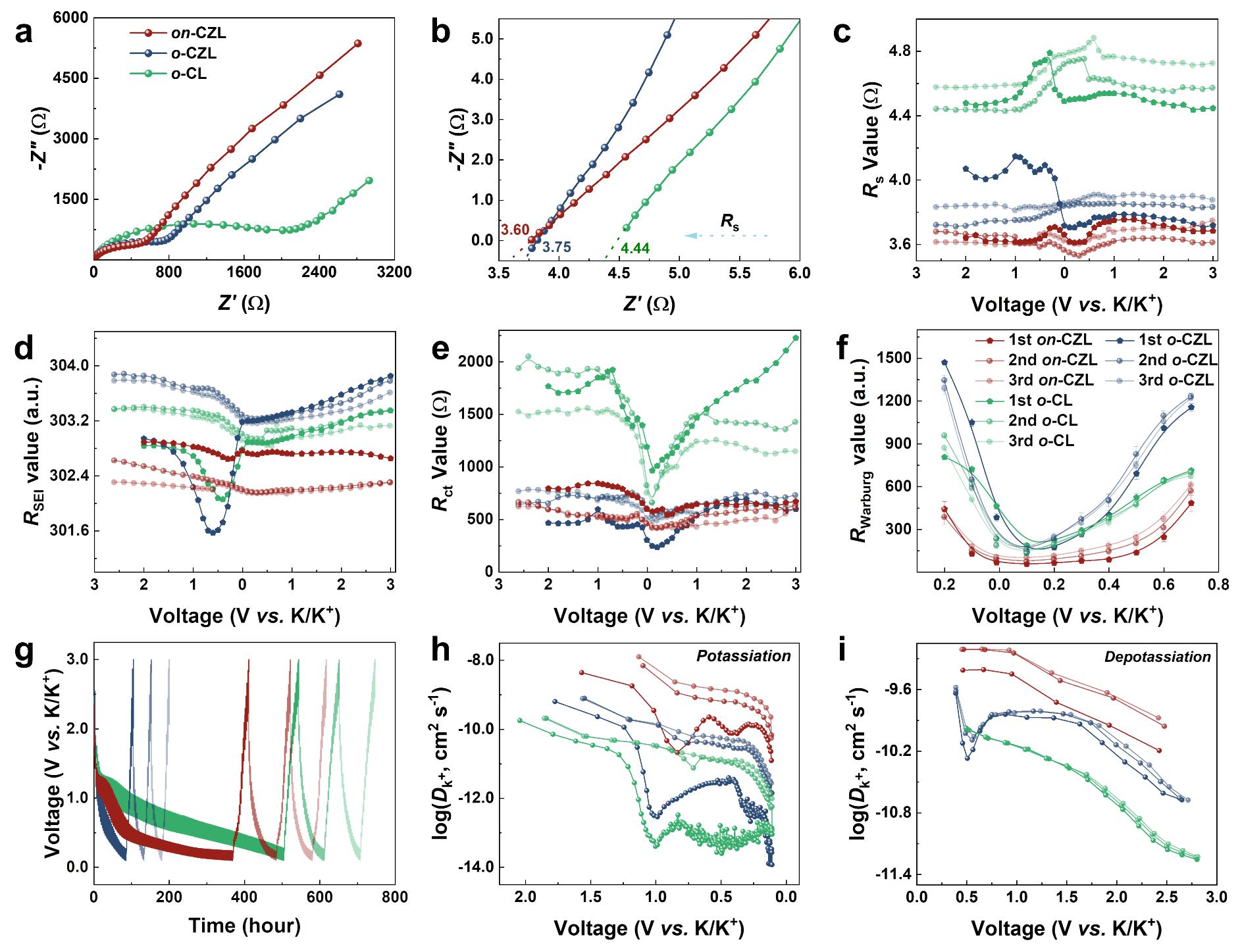 图4. on-CZL、o-CZL、o-CL负极的钾离子储存动力学。(a)在3 V vs. K/K+电压下获得的EIS Nyquist图;(b)在高频区域的放大Nyquist图;(c-f)前三圈循环的Rs、RSEI、Rct、RWarburg参数;(g)GITT曲线;(h,i)化学扩散系数。