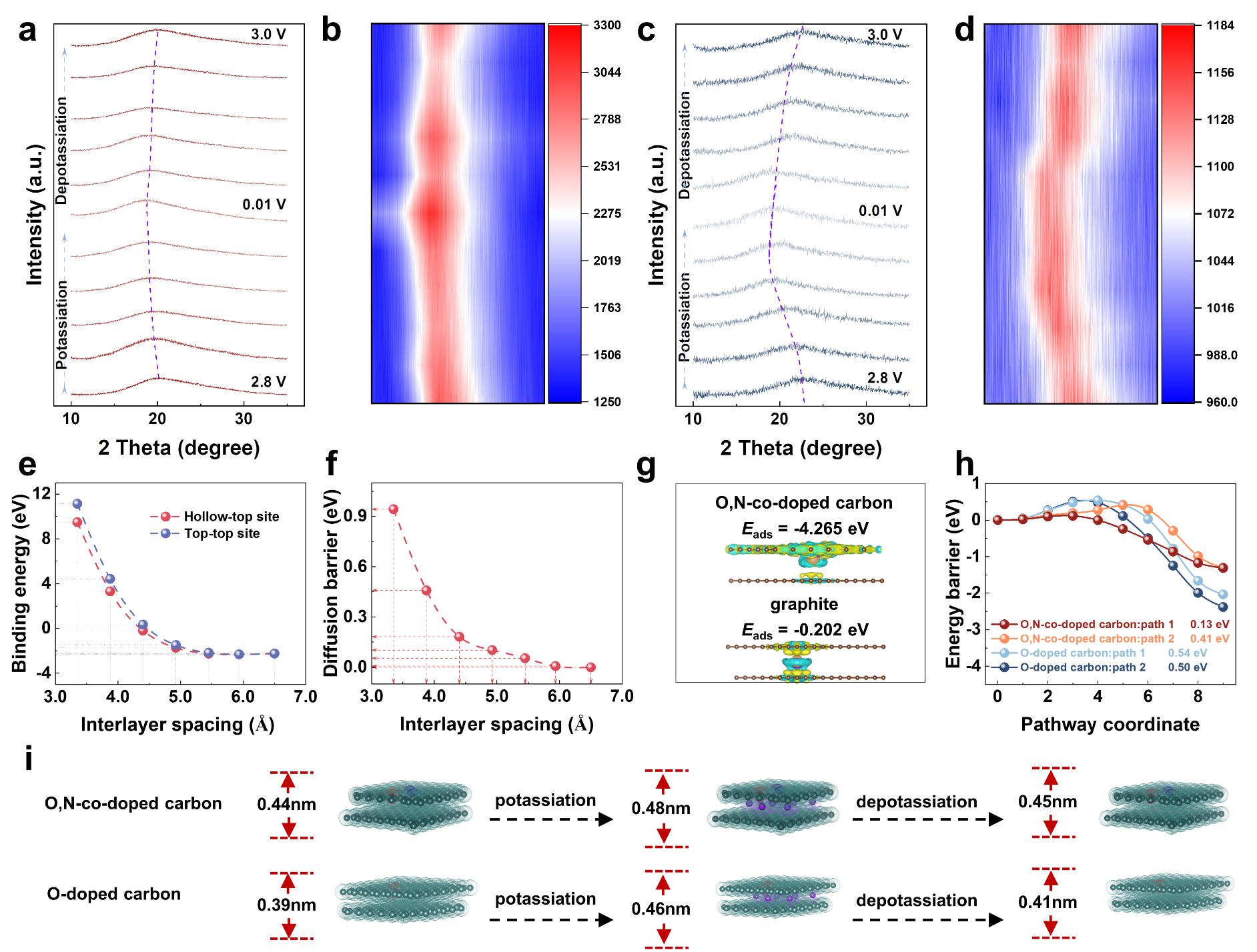 图5. on-CZL负极中钾离子储存分析。不同放电/充电电位下(a,b)on-CZL和(c,d)o-CZL的非原位XRD图谱;(e,f)不同层间距的石墨模型中钾的结合能和扩散势垒;(g)差分电荷密度图和吸附能;(h)在不同石墨构型下钾的扩散能垒;(i)在放电和充电过程中不同石墨构型的KCx变化示意图。