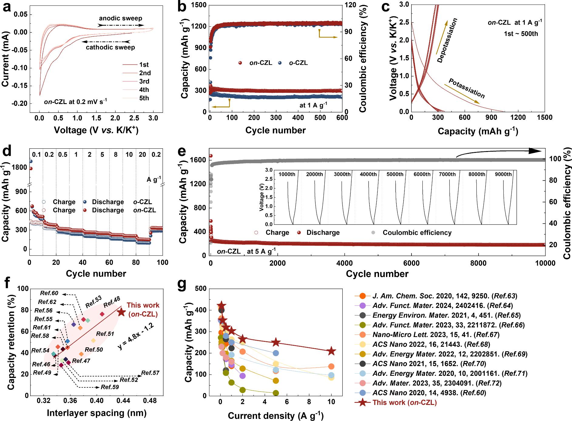 图3. on-CZL负极在钾离子半电池中的电化学行为。(a)伏安曲线;(b)循环性能;(c)充放电曲线;(d)倍率性能;(e)长循环性能;(f)容量保持指数与碳层间距的关系;(g)倍率性能对比。