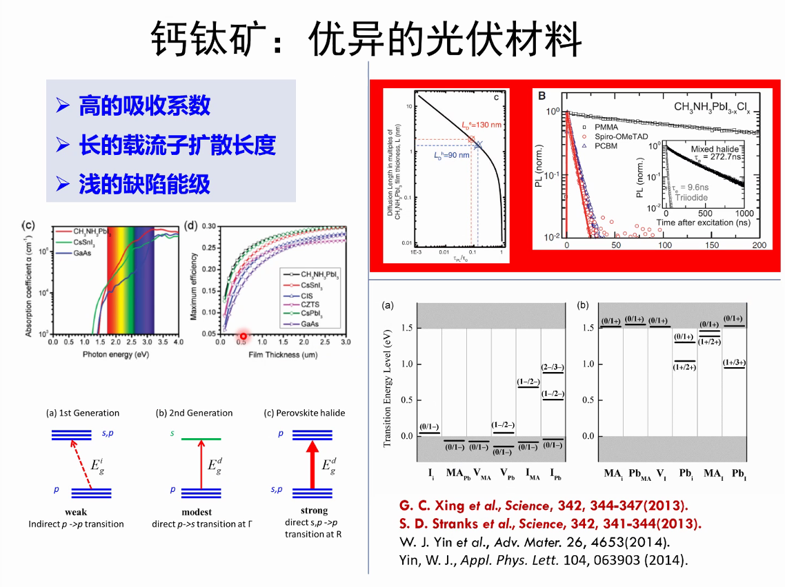 光伏产业是基于半导体技术和新能源需求而兴起的朝阳产业,谭教授首先介绍了目前太阳能发电的应用情况和其对于国家能源战略发展的重要意义。在目前使用的诸多太阳能电池中,钙钛矿太阳能电池在短短十年内发展迅速,其转换效率从2009年的3.8 %提升至25.2 %,不断接近实现高效率、低成本的太阳能电池的目标。相较于砷化镓Ⅲ-Ⅴ族等光伏材料,钙钛矿材料具有高吸收系数、长的载流子扩散长度和浅缺陷能级等优势。
