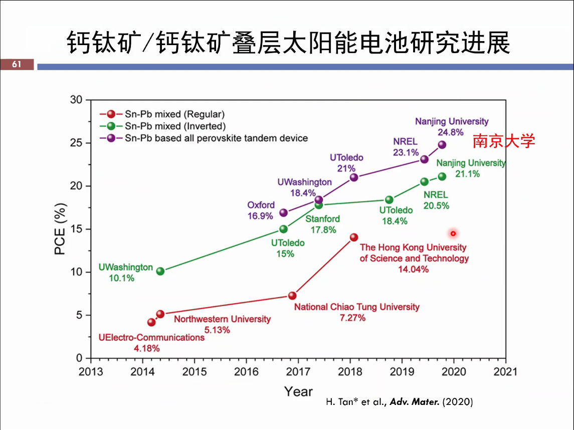 钙钛矿叠层太阳能电池是一种非常有潜力的低成本高效光伏技术,谭教授随后介绍了钙钛矿/晶硅叠层太阳能电池和钙钛矿/钙钛矿叠层太阳能电池的发展意义,并针对钙钛矿/钙钛矿叠层太阳能电池的近期研究成果进行详细讲解;分别介绍了锡粉对于钙钛矿前驱体溶液Sn2+氧化的抑制作用进而实现高效率Pb-Sn窄带隙电池和钙钛矿/钙钛矿叠层太阳能电池的隧穿复合结的探索过程及其在叠层器件中的意义。目前以谭教授研究团队已经将钙钛矿/钙钛矿叠层太阳能电池的转换效率提升至24.8%,达到世界领先水平,在这个充满科研活力的领域,这个记录也将不断更新。