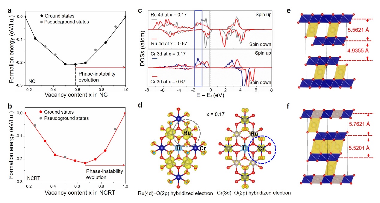 图1. NC中钠空层的形成和NCRT中钠空层抑制的理论计算。(a)NC和(b)NCRT在0.17 ≤ x ≤ 1.0钠空位范围内形成能与空位含量(x)的函数关系。黑色(NC)和红色(NCRT)圆点代表基态,灰色圆点代表赝基态。(c)NCRT中过渡金属混合层中,x = 0.17和x = 0.67时,Ru-4d电子和Cr-3d电子的PDOS图。(d)基于图c获取的在-1.0 ≤ E - Ef ≤ 0和-2.0 ≤ E - Ef ≤ -1.0区间电子空间分布。钠空位为0.67时(e)NC和(f)NCRT的原子示意图和相应的两过渡金属层间的距离。其中NC中两过渡金属层间距为5.5621和4.9355 Å,NCRT中两过渡金属层间距为5.7621和5.5201 Å。