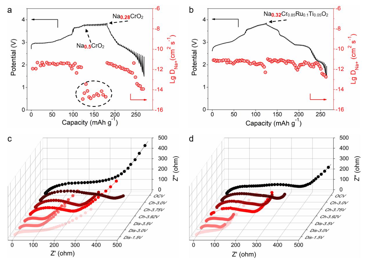 研究团队通过选取NaCrO2为模型材料,发现这种不利迁移现象是由于高充电电位下随机脱钠过程诱导的钠空层所导致的。这种随机脱钠过程可以归因于过渡金属层仅有Cr参与电荷补偿。在随机脱钠过程中,Cr在相邻两层过渡金属层的均匀氧化将会诱导同一钠层的钠随机脱出,进而导致钠空层的形成。理论计算、高角环形暗场扫描透射电子显微镜和恒流间歇滴定技术结果揭示了钠空层的形成和抑制。一种Ru/Ti共掺杂策略被报道用于解决过渡金属迁移的问题,其中4d-Ru在充电过程中首先被氧化来抑制随机脱钠过程的出现,非活性的3d-Ti可以起着柱撑的作用来抑制含Ru的过渡金属相邻的钠层的完全脱钠,最终表现出优异的电化学性能。该工作对理解钠离子电池层状氧化物正极材料过渡金属离子迁移提供了新视角,并提供了有效的改善策略。