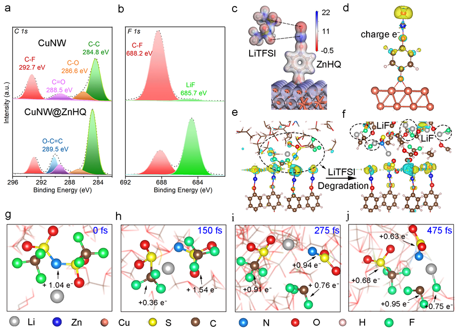 图2. LiTFSI降解的机理分析:CuNW和CuNW@ZnHQ:a)C 1s和b)F 1s信号。c) LiTFSI和ZnHQ表面的静电势分布。d)带负电荷的ZnHQ在Cu上的差分电荷密度图。LiTFSI分解之前和之后的e)和f)的差分电荷密度图。AIMD模拟快照g)0 fs,h)150 fs,i)275 fs,和j)475 fs