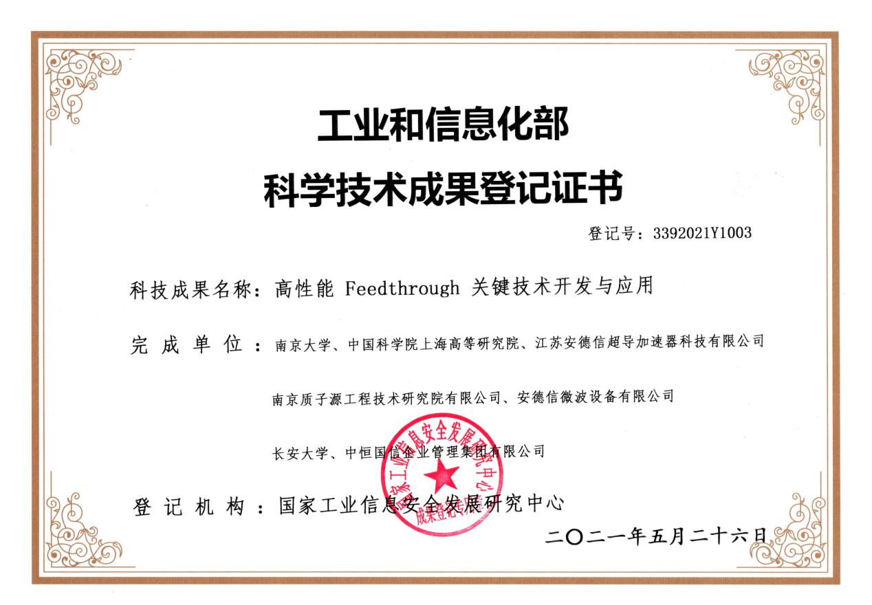 近日,工信部国家工业信息安全发展研究中心给太阳成集团122ccvip、中国科公司上海髙等研究院、江苏安德信超导加速器科技有限公司、南京质子源工程技术研究院有限公司、安德信微波设备有限公司、长安大学、中恒国信企业管理集团有限公司七家单位颁发了“高性能Feedthrough关键技术开发与应用"科学技术成果登记证书。这意味着由太阳成集团122ccvip南京质子源孙安团队与中国科公司上海髙等研究院、安德信科技等七家单位联合,经过八年科技攻关,终于打破了国外技术垄断,填补了国内空白,解决了高性能Feedthrough这一“卡脖子”技术。