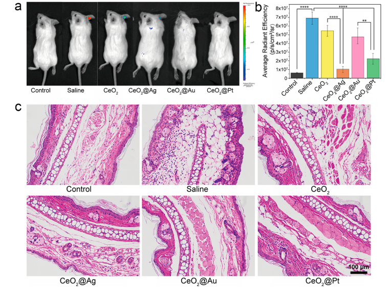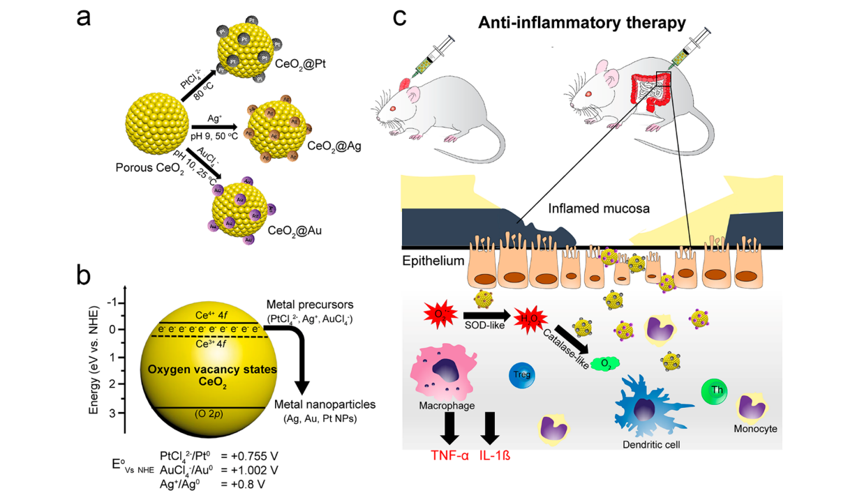 具有类酶活性的功能纳米材料被称为纳米酶,近年来受到了广泛的关注。多篇研究表明,纳米氧化铈和贵金属纳米颗粒都分别具有良好的类酶催化活性,且其类酶活性也已被探索用于治疗活性氧(ROS)相关的疾病。因此,我们利用CeO2@金属纳米结构的抗氧化特性来治疗小鼠溃疡性结肠炎(UC)和耳朵炎症模型。我们的发现揭示了CeO2@金属纳米酶具有ROS清除能力,并且通过下调促炎细胞因子:白细胞介素-1β(IL-1β)和肿瘤坏死因子-α(TNF-α)抑制了炎症进展。在这三种纳米酶中,CeO2@Ag表现出优异的治疗活性,这归因于其优异的类超氧化物歧化酶(SOD)和过氧化氢酶(CAT)活性。浓度低至0.5毫克/千克体重的CeO2@Ag在UC和耳部炎症模型中明显地抑制了炎症过程。