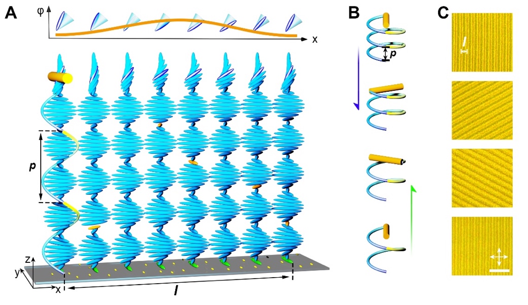 图 2. 均匀取向半开放胆甾相液晶薄膜 (A) 螺旋结构示意图及周期性相位变化,(B) 光驱动解旋过程及显微织构变化。比例尺20 μm