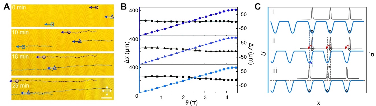 图 4. 转动-平动转换(A) 微球粒子单向输运,比例尺50 μm,(B) 横向Δx和纵向Δy位移与旋转角度θ的关系,(C) 光驱动微球输运的势能分析。