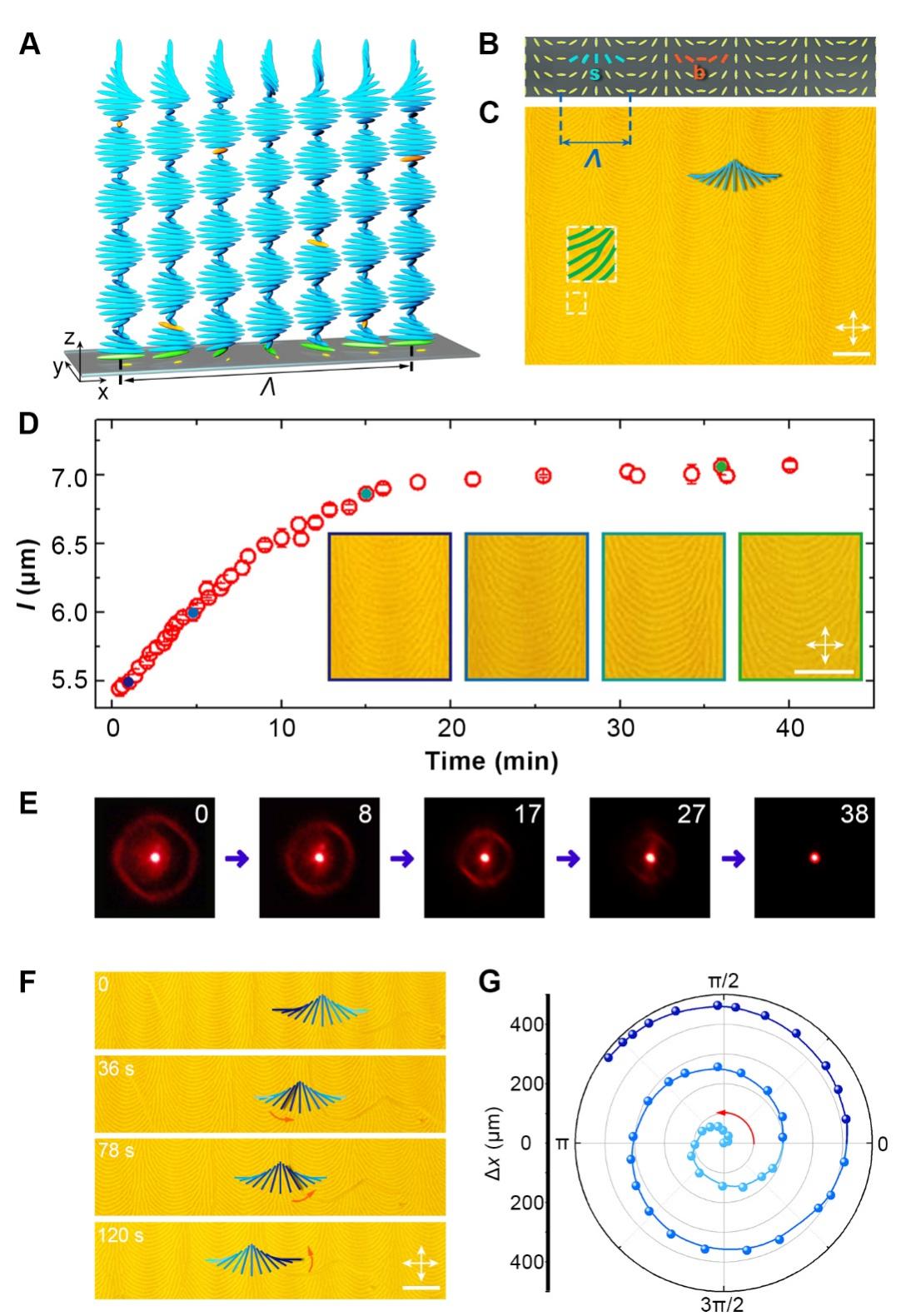 图 3. 弧形光栅织构的光驱动演变 (A) 图案化取向的螺旋超结构示意图,(B) 取向示意图,(C) 周期性拱形光栅织构,插图为刃型位错,(D) l与曝光时间的关系,(E) 衍射图案演变,(F) 弧形光栅织构的光驱动平移,(G) 水平位移Δx与解旋角度θ的关系。比例尺50 μm