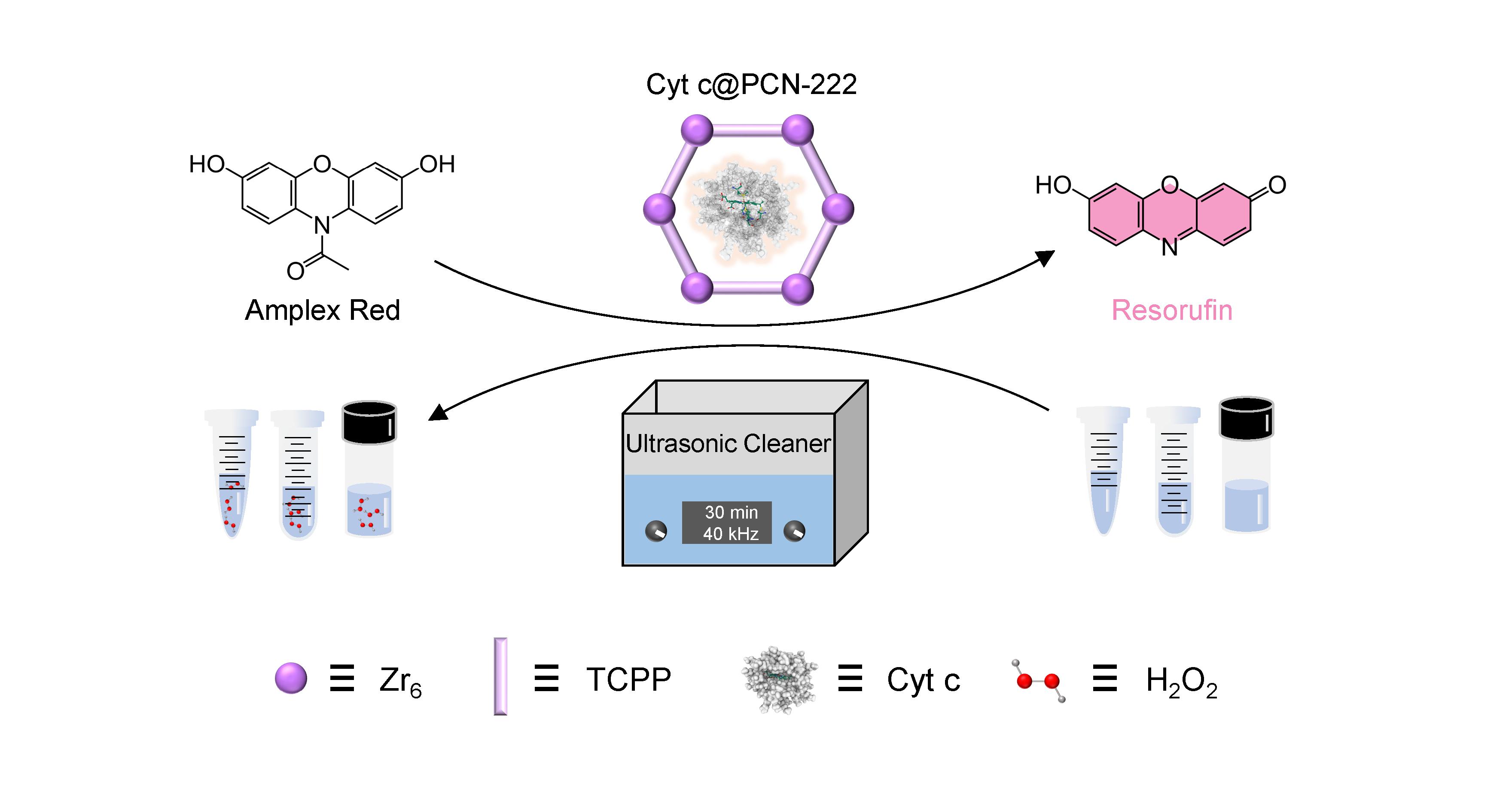 受此启发,魏辉团队及其合作者构筑了一种细胞色素c(Cyt c)与PCN-222复合的过氧化物纳米酶,即Cyt c@PCN-222。将Cyt c限域到PCN-222纳米粒子的介孔中,Cyt c的类过氧化物酶活性得到显著的提高。同时,MOF的孔径对Cyt c的限域具有显著的影响,随着孔径的增大,Cyt c的负载率得到提高,PCN-222表现出最高的负载率。动力学结果表明,Cyt c活性的提高源于限域提高了其对双氧水的亲和性。该限域策略对活性的提高适用于多种底物。进一步,该团队构建了超灵敏的检测方法,展现出对双氧水极低的检测限(0.13 μM)。运用已构建的检测方法,发现超声仪器的日常使用会导致双氧水的形成,这为超声仪器的合理使用提供了一定的指导意义。