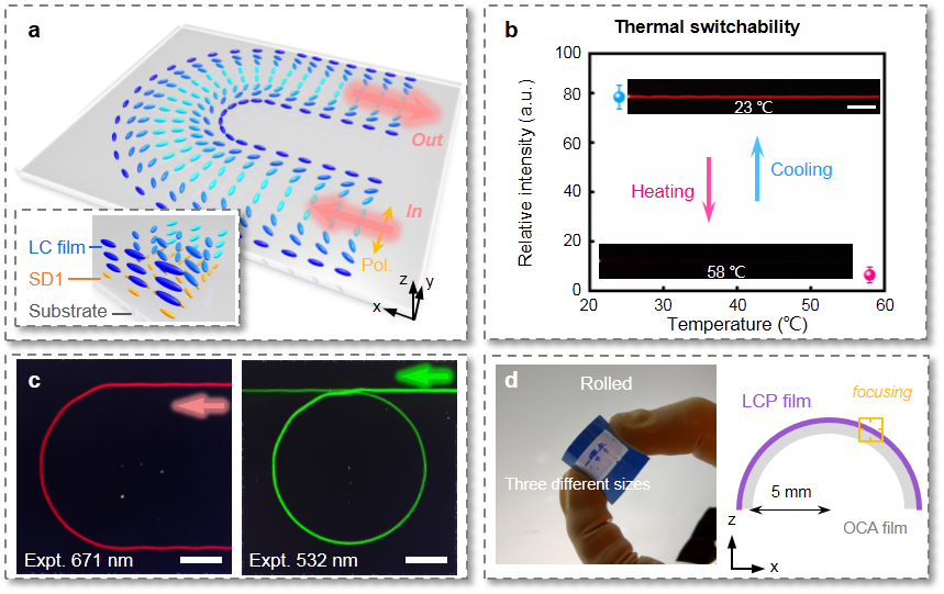 针对这一目标,该研究团队利用光控取向技术进行液晶指向矢面内分布的精确操控,以获得预设的各向异性折射率空间分布,从而制备出一系列基于均质液晶材料的渐变折射率波导元件。论文中展示了直形/U型波导、环形谐振腔等多种集成光子元件。基于液晶这类软物质的内禀外场刺激响应特性,团队还通过热调控和入射偏振变化实现了波导功能的调谐与开关。上述设计同样适用于光聚合液晶薄膜材料,这赋予该类液晶波导元件优良的柔韧性。通过有选择性的局部聚合,结合电场、光场等外场的定点操控,有望实现固定功能元件之间的动态波导连接,从而为未来可编程集成光子芯片提供一种可能的方案。