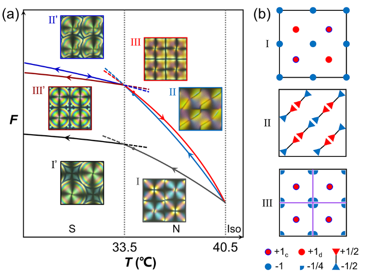 为了清晰的展示上述缺陷转变过程,团队结合实验结果与理论计算给出了整个相变过程的自由能F-温度T关系图(图3a)。三种向列相织构的能量关系依次为:I(点缺陷)<II(向错线)<III(墙结构);而对于三种近晶相织构:I’(-TFCD)<II’(l-TFCD)<III’(受挫TFCD)。对上述织构的拓扑特征分析表明:在整个相变过程中,虽然重复单元的总拓扑荷守恒,但具体拓扑种类和分布具有显著差异,而拓扑不变性限制了三种不同向列相织构间的直接转化(图3b)。研究还进一步发现,在N-S相变过程中,不同拓扑缺陷沿着特定的路径演化:中心汇聚型+1点缺陷变成TFCD,中心发散型+1点缺陷变为具有正高斯曲率的畴,并交替嵌入TFCD阵列;±1/2向错线转变为位错,经历热循环后移动至畴边缘处消失,升温对应到向列相的交叉墙缺陷织构。