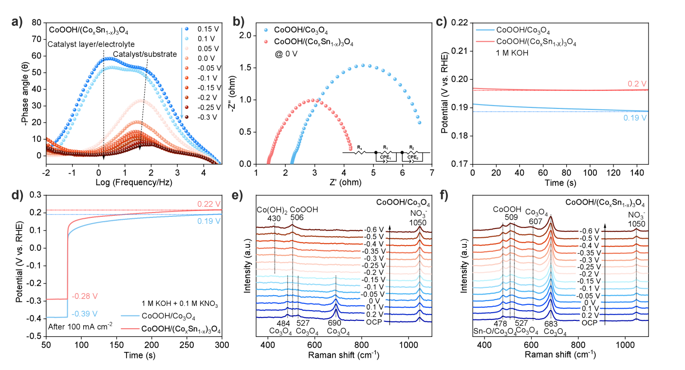 图5. 电子转移及活性中心指认。a) CoOOH/(CoxSn1-x)3O4的原位EIS Bode图;b) 在0 V 时的EIS Nyquist图;c) 开路电压测试;d) 在100 mA/cm2的电流下极化后的开路电压测试;e)CoOOH/Co3O4和f) CoOOH/(CoxSn1-x)3O4的原位拉曼光谱。