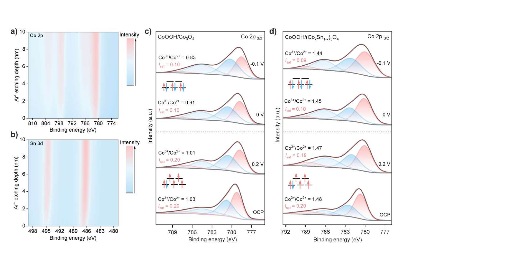 图4. 自旋态转变及活性中心的稳定性。CoOOH/(CoxSn1-x)3O4的a) Co 2p和b) Sn 3dXPS深度剖析;c) CoOOH/Co3O4和d) CoOOH/(CoxSn1-x)3O4的Co 2p3/2芯能级的原位XPS谱。
