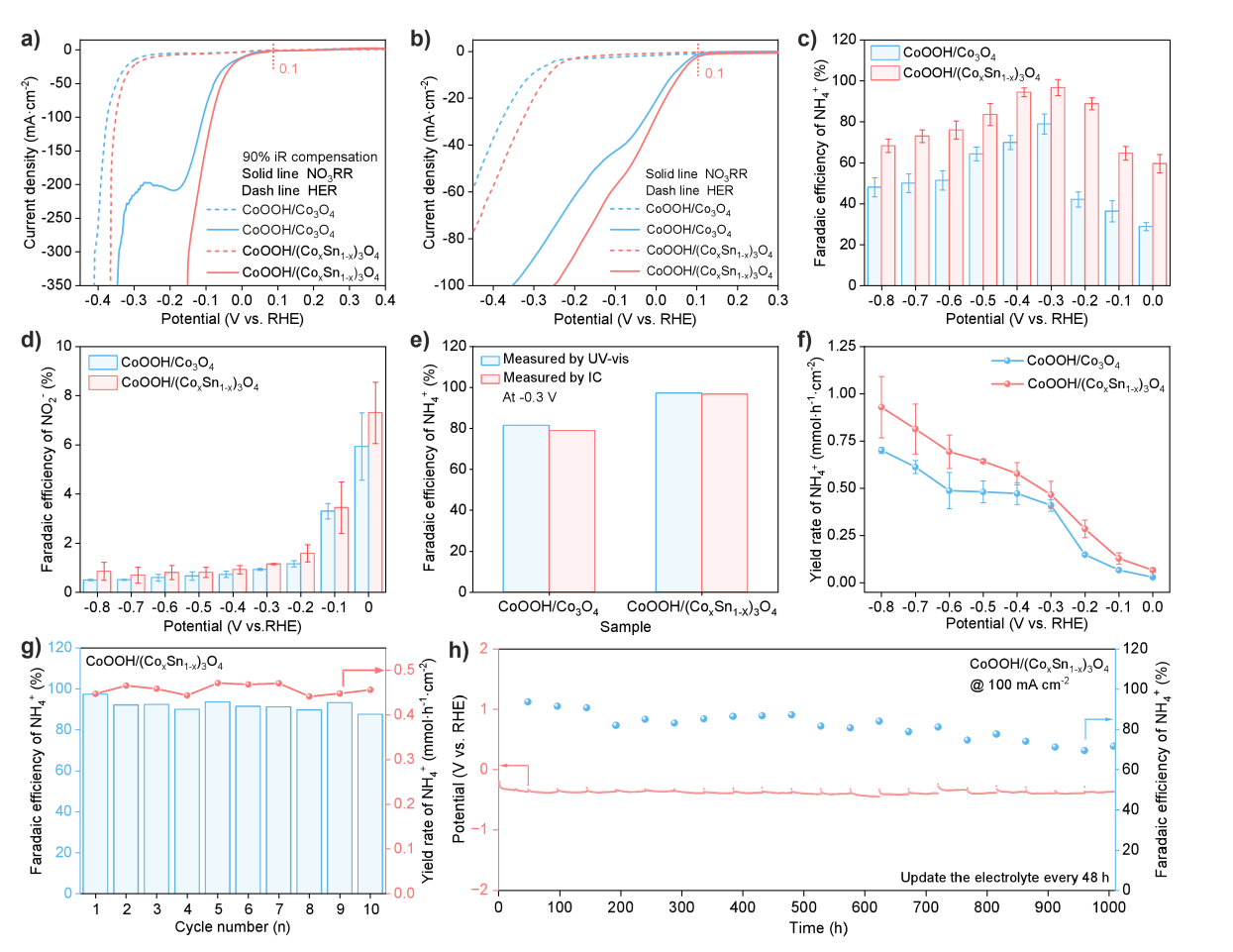 在0.1 V (vs. RHE) 电位下,CoOOH/Co3O4和CoOOH/(CoxSn1-x)3O4催化剂均表现出硝酸根还原反应的起始活性。然而,CoOOH/(CoxSn1-x)3O4展现出更优越的本征NO3RR活性及更快的反应动力学。相比之下,CoOOH/Co3O4在反应过程中伴随一个显著的还原峰,该峰归因于高活性的Co3+被还原为低活性的 Co2+。这一还原过程显著增大了反应的过电位。CoOOH/(CoxSn1-x)3催化剂在 -0.3 V (vs. RHE) 时,NH4+的法拉第效率高达96.7%。此外,该催化剂在10次连续循环测试及-100 mA/cm2恒定电流密度下持续运行1000小时后,性能均未出现衰减。综上,CoOOH/(CoxSn1-x)3催化剂在硝酸根还原反应中展现出卓越的催化活性、高选择性和优异的长期稳定性。