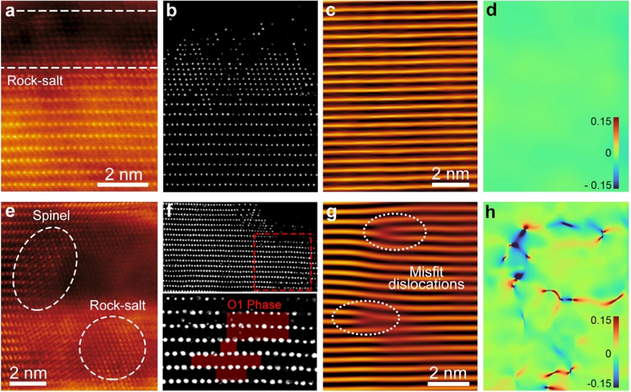 图4. 循环后正极颗粒的相变、晶格失配和内部应力分布分析。循环后 P-LCO 正极颗粒的近表面 (a, b) 和体相 (c)的HAADF-STEM 图。(d) 循环后 P-LCO 正极体相的几何相位分析(GPA)。(e−g) 循环后 LCO 正极颗粒体相的 HAADF-STEM 图。(h) 循环后 LCO 正极颗粒的 GPA 图谱。