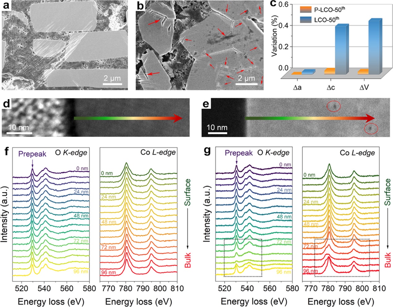图3. 4.75 V电化学循环后正极材料的形貌与结构变化分析。(a) 循环后的P-LCO电极和(b) 循环后的LCO电极的横截面SEM图像。(c) P-LCO和LCO电极在4.75 V高压下循环50圈后晶格参数变化的对比。(d, f) 循环后的P-LCO正极颗粒,以及(e, g) 循环后的LCO正极颗粒,从表面到体相的O K-edge和Co L-edge的EELS图谱。