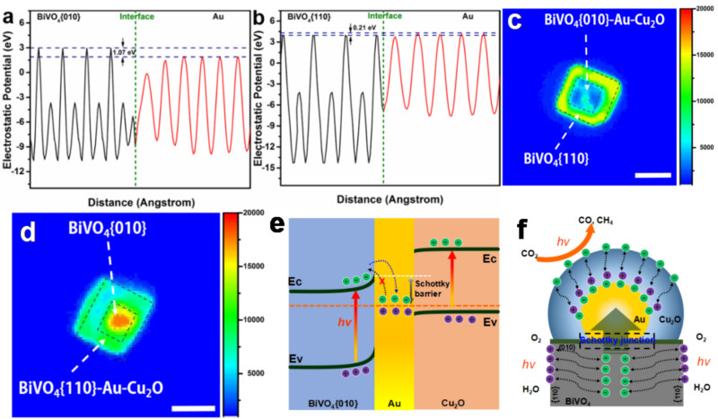 BiVO4{010}-Au-Cu2O 和BiVO4{110}-Au-Cu2O Z型光催化体系(b-e)。