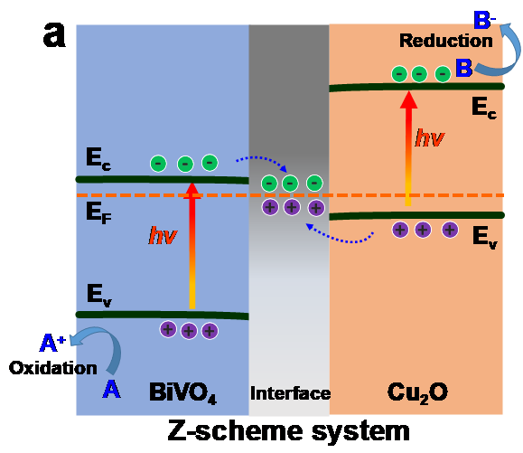 图1.Z型光催化体系,氧化还原反应分别发生在氧化还原能力较强的半导体上(a)。