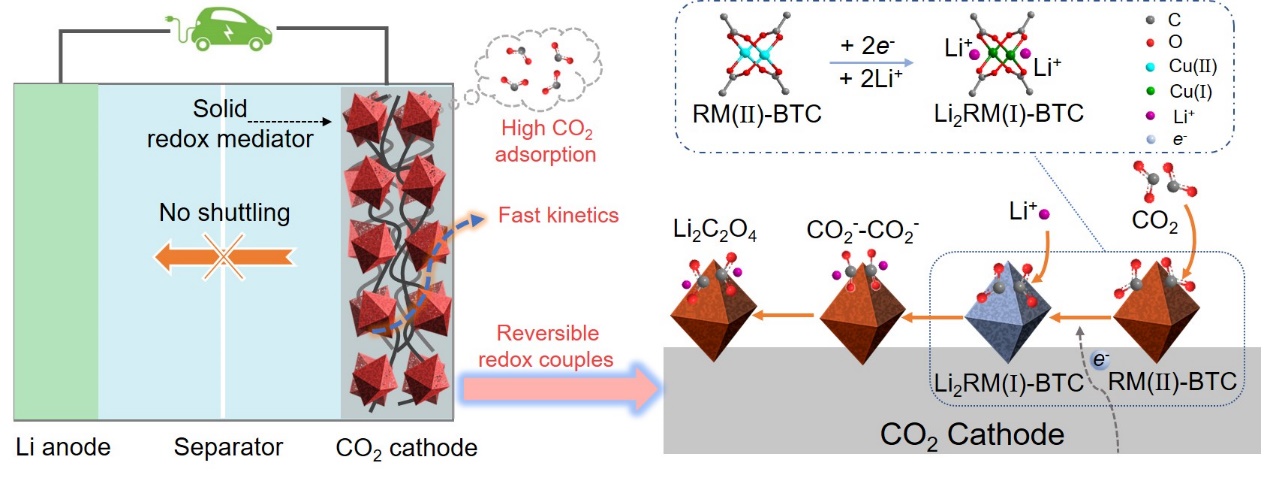 二氧化碳捕获与利用在二氧化碳减排,减缓全球变暖,以及潜在的未来火星探索等领域正受到越来越多的关注。近年来,锂-二氧化碳电池作为一种新型电池体系可以有效利用温室气体并提供高比能量的电能,而获得日益广泛的关注。然而,在现实中,它的广泛实施仍有许多技术挑战需要克服。首先,由于二氧化碳固有的电化学惰性,使得二氧化碳的直接电还原反应十分具有挑战性,直接导致锂-二氧化碳较低的放电电压 (< 2.0 V)。其次,该反应的主要放电产物Li2CO3为宽带隙绝缘子,导致较高的充电平台(> 4.3V),并进一步引发大量副反应和降低电池的循环稳定性。为有效提高锂-二氧化碳电池输出电压并降低充电过电位,使得该新体系电池满足高品质电能的要求,太阳成集团122ccvip太阳成集团122ccvip何平教授与周豪慎教授在前期二氧化碳电化学还原和析出机理探索和相关液相催化剂研究的基础上,首次提出了一种锂-二氧化碳电池使用的固态氧化还原介质,即将苯-1,3,5-三羧酸与Cu(II)配位形成的金属有机框架材料(RM(II)-BTC)固定在正极上,该技术有效地规避了可溶性氧化还原介质的穿梭效应和缓慢动力学问题。结果表明,处于电化学还原态的RM(I)-BTC固态氧化还原介质有效地捕获CO2,通过涉及二聚草酸中间体的二聚反应促进Li2C2O4的形成,从而降低了充放电过电位(图1)。