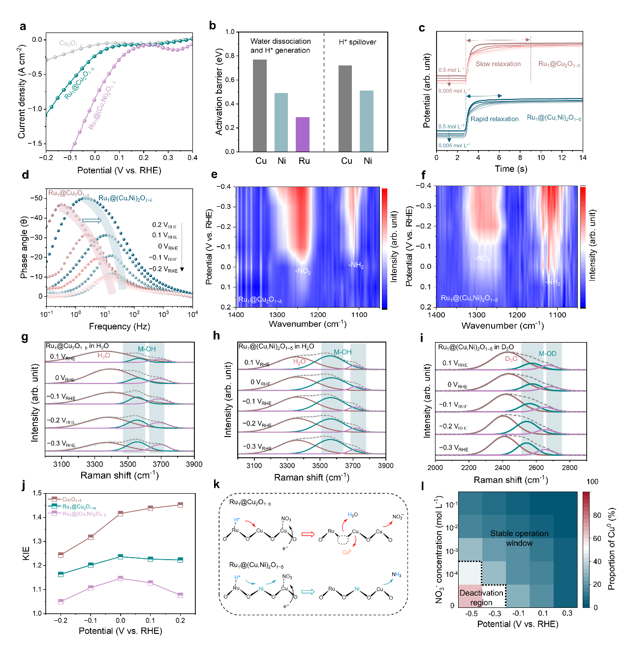 硝酸根还原反应需要大量的活性氢(H*),研究团队在铜基氧化物纳米片电催化剂表面修饰Ru单原子,极大降低了水解离生成H*的能垒。与此同时,在硝酸根还原过程中引发催化剂还原失活的主要因素同样在于催化剂表面产生的大量强还原性的H*。团队提出“缓冲掺杂”策略:将Ni2+等难以被H*还原的金属离子掺入Cu2O1−δ晶格,在表面构筑Ni–OH网络,为反应中间体H*提供缓冲和溢流通道,从而抑制H*对Cu–O晶格的侵蚀。另一方面,该网络有利于H*快速传递到附近NO3−的吸附位点,促进其快速加氢反应生成NH3。该策略有效拓宽了电催化剂稳定工作的二维电化学窗口,使其在更负电位和更低NO3−浓度下仍能保持结构与性能的高度稳定。该催化剂在−0.1 V vs. RHE的电位下可以达到−1.6 A·cm−2的电流密度,稳定性较未修饰的催化剂有2–3个数量级的提升。