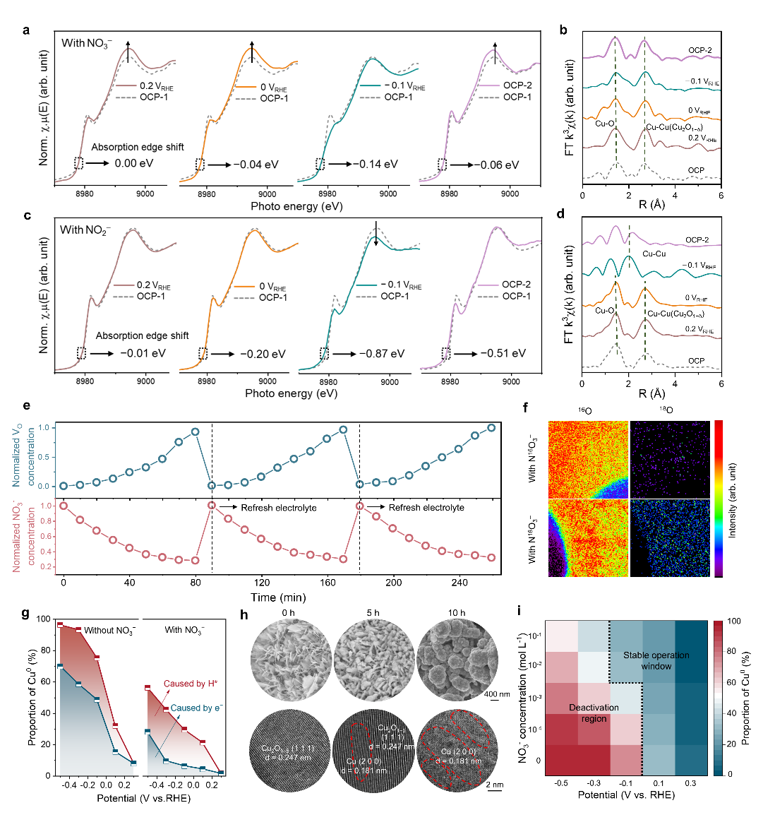 在这项工作中,研究团队首先以Cu2O为模型电催化剂,利用原位电化学XAFS等手段,研究NO3−还原过程中电催化剂的结构演变。结果表明,催化剂的稳定运行不仅由外加偏压决定,还强烈依赖于电解液中NO3−的浓度:在高NO3−浓度和适当的偏压下,晶格氧流失与来自NO3−的氧填补形成动态平衡,催化剂保持Cu2O1−δ的动态稳定状态;而在低NO3−浓度和较负电位下,晶格氧持续流失,大量Cu+被还原为金属态Cu0,催化剂迅速发生不可逆的相变和形貌塌陷。基于此,研究团队提出了铜基氧化物在硝酸盐还原中的“二维电化学窗口”概念:即催化剂的稳定区由“电位-NO3−浓度”这两个维度共同决定,而传统只考虑电位的一维稳定窗口描述已不足以刻画实际工况下的重构行为。