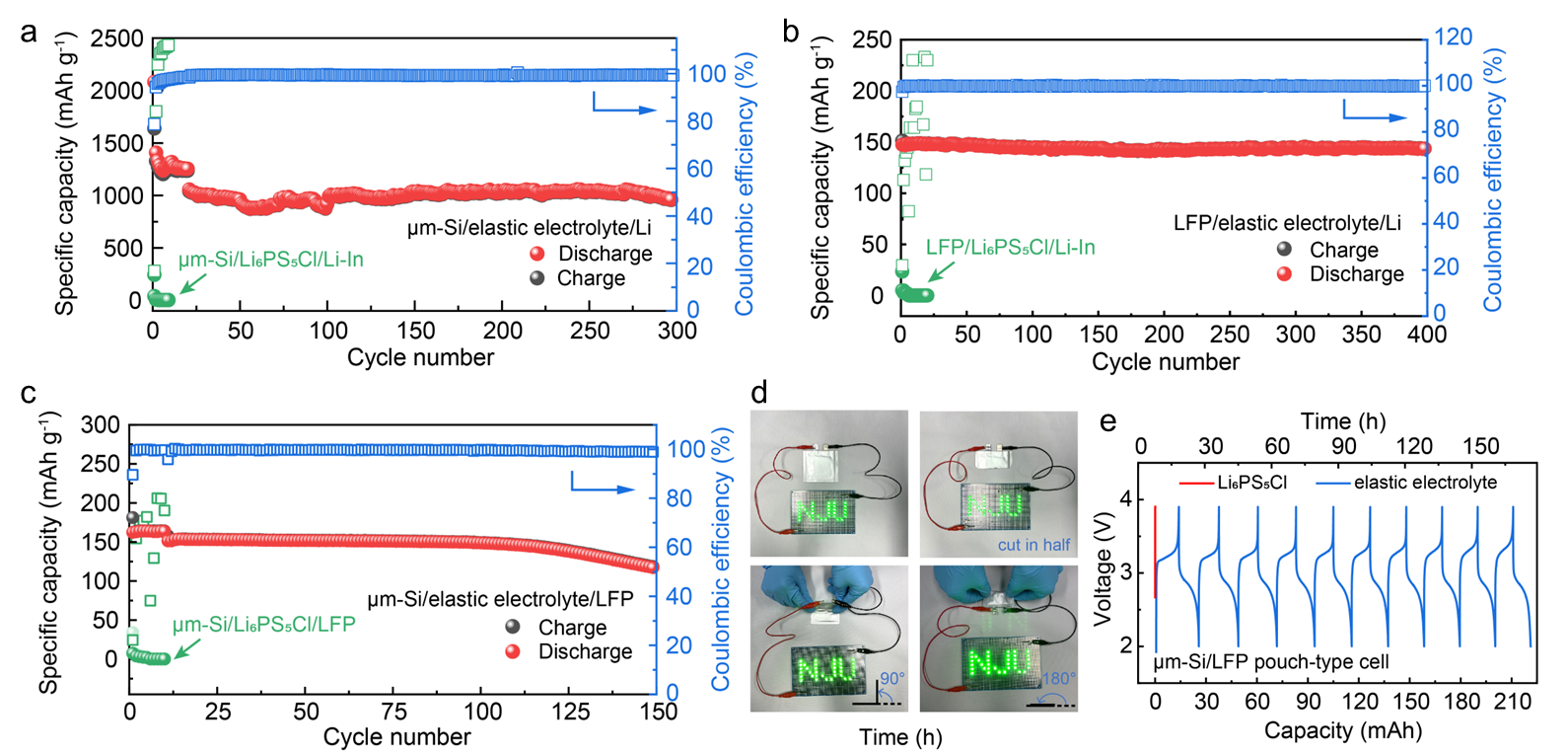 图2使用弹性电解质的固态电池在零外加压力、仅依靠电池内建应力情况下的电化学性能。(a) μm-Si||Li电池;(b) LiFePO4||Li电池;(c) LiFePO4||μm-Si全电池的长循环稳定性;(d) LiFePO4||μm-Si软包电池剪切、弯折实验;(e) LiFePO4||μm-Si软包电池充放电曲线。