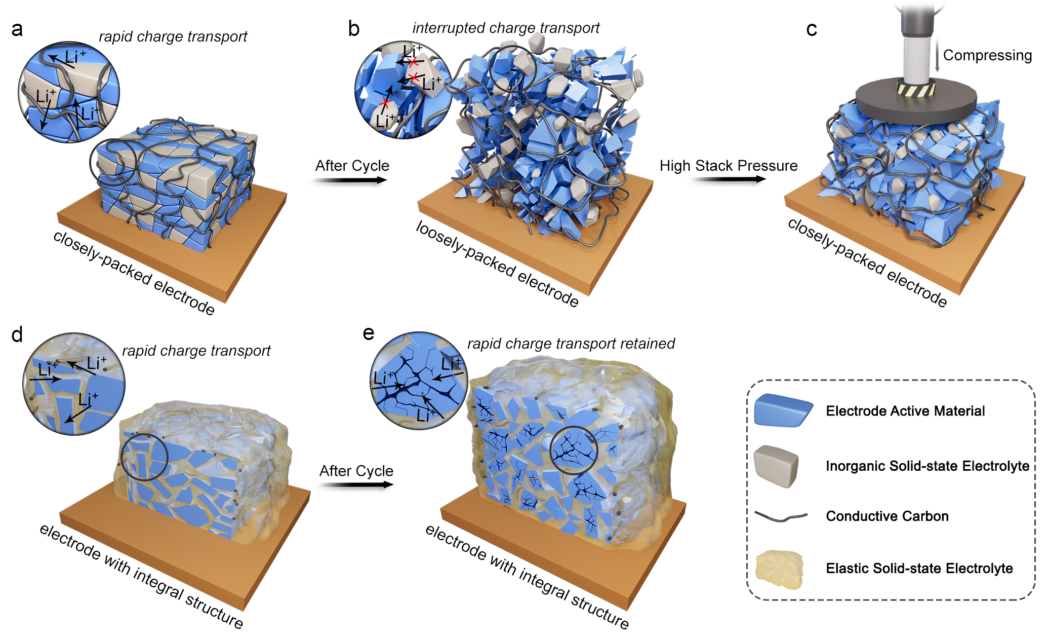 图1固态电池失效机理及其解决方案示意图。(a)-(c) 使用无机固态电解质的固态电池循环后电极粉化,离子输运受阻。施加高外加压力可缓解这一问题,但大大降低了电池的能量密度并增加了成本。(d)-(e) 具有高离子电导率的弹性电解质填充多孔电极并包裹活性材料,实现电极内部稳定高效的离子传输。