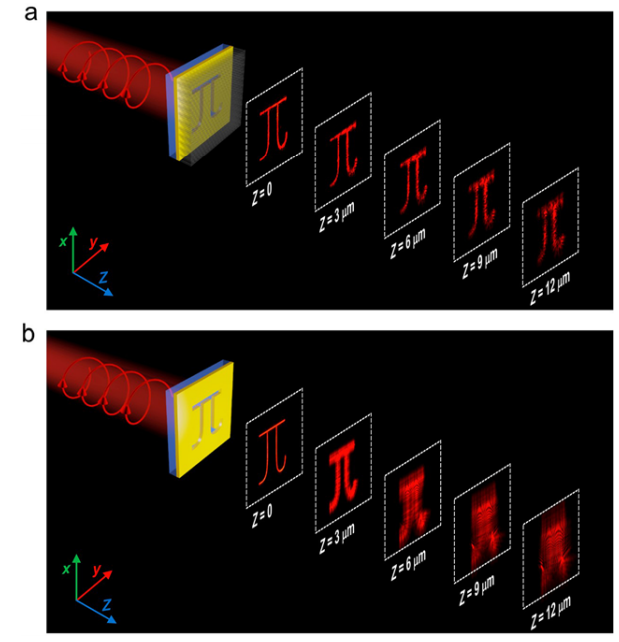 基于角度选择透明特性,合成的超构材料薄膜可以应用于衍射受限的远场投影成像中。由于受到衍射和干涉的影响,一个20 μm × 25 μm的符号 π在空间中自由投影的距离小于6 μm,而在覆盖了光学超构材料薄膜之后其像斑可以被很好的投影到12 μm以上(理论计算可达50 um以上),其证明了这种特殊的超构材料薄膜在抑制光的衍射和干涉方面有很大的优势。另外,由于极小的透明窗口、超薄的平面架构以及较好的环境容忍性使这种光学超构材料在包括私密保护及光束准直等领域有望发挥更大的作用。