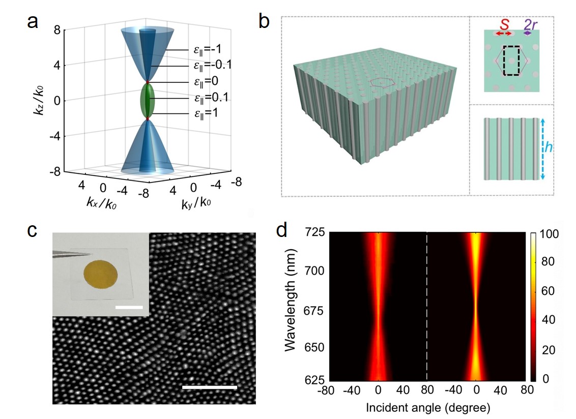 光学超构材料作为一种新型人工复合材料,具有自然材料所不具备的超常电磁特性,为超控电磁波提供了全新的技术途径。公司徐挺教授课题组,通过在原理上调节金属纳米线阵列超构材料的色散等频率面,使其拓扑形态发生椭球面到双曲面的拓扑转变,并在临界点附近实现了极小的角度选择性透明(理论计算中心波长透明窗口范围−2° <θ< 2°)。结合理论参数设计,通过电化员工长的方法在多孔氧化铝模版中填充银纳米线,合成了大面积的光学超构材料薄膜,并在实验中获得了极窄的光学透明窗口。