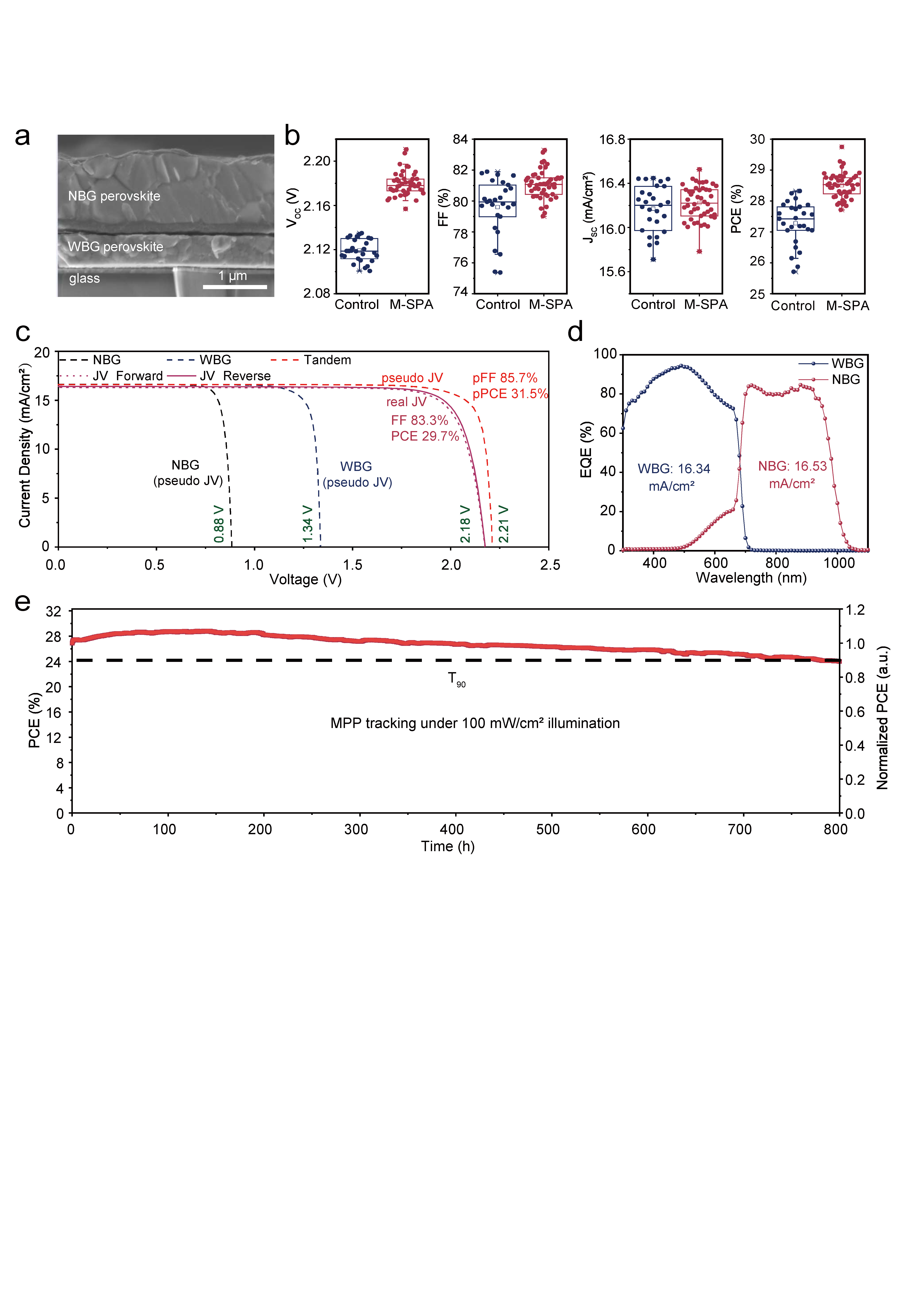 结合以上研究和器件设计的思路,通过将该宽带隙子电池与高效的窄带隙子电池进行串联,结合良好的光电匹配设计,构筑了高性能的全钙钛矿叠层太阳能电池(图4a)。M-SPA制备策略的应用有效地提升了全钙钛矿叠层电池的开路电压、填充因子以及转换效率(见图4b)。该器件实验室自测光电转换效率实现了创纪录的29.7%,开路电压高达2.175 V,电流密度为16.4 mA·cm-2,填充因子为83.3%(图4c-d)。在持续的近红外LED照明下,该器件连续运行750小时仍能保持其初始转换效率的90%,展示出优异的光照稳定性(图4e)。经国际权威机构JET第三方认证,全钙钛矿叠层太阳电池的稳态光电转换效率高达29.1%。上述优异的稳定性与转换效率表明,M-SPA方法在全钙钛矿串联太阳能电池的实用化过程中发挥了关键作用,为未来商业应用奠定重要基础。
