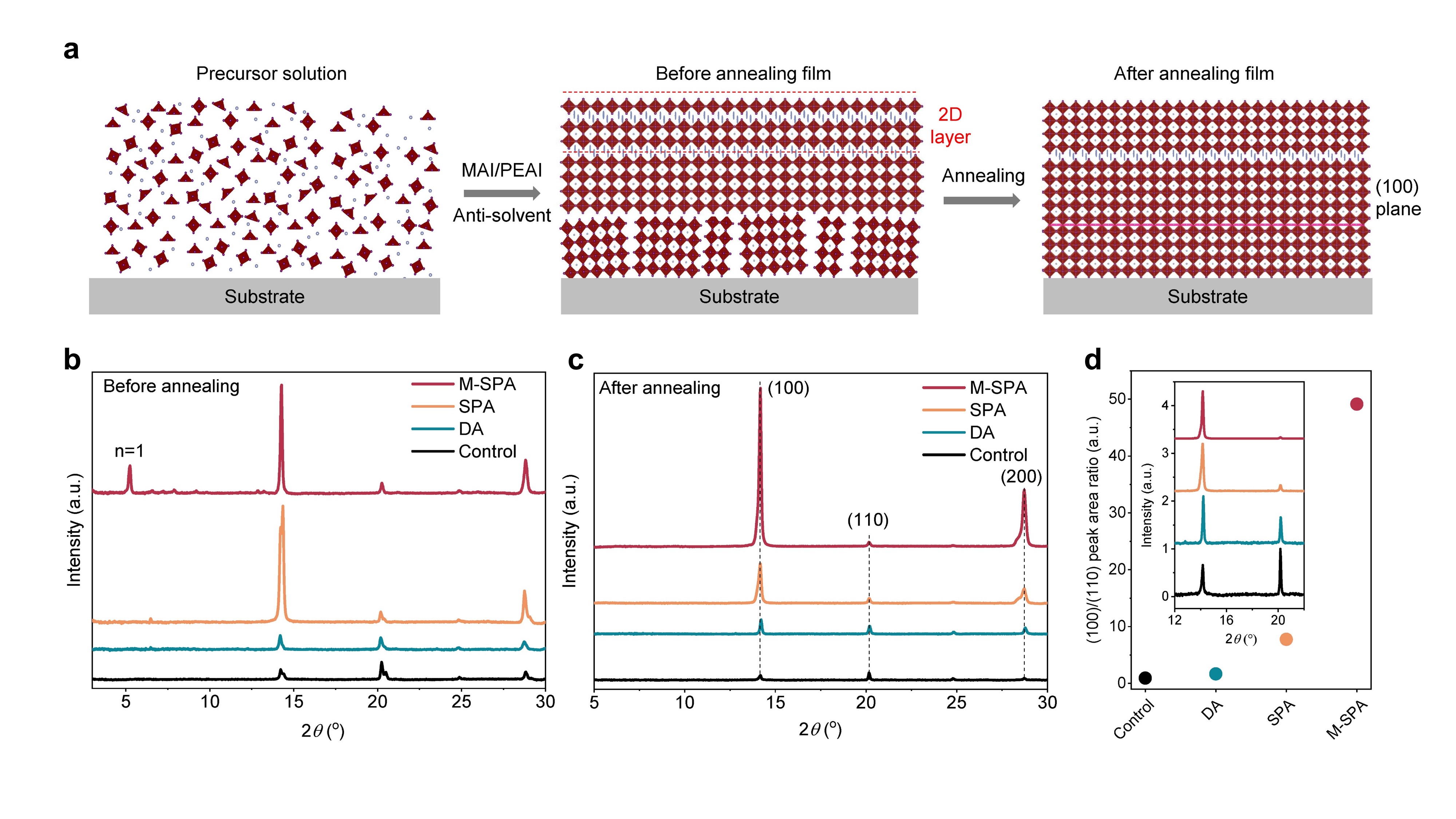 图1. DA、SPA和M-SPA钙钛矿薄膜的形成过程。a, M-SPA钙钛矿成膜过程示意图。b, DA,SPA和M-SPA钙钛矿前驱体薄膜的XRD。c-d,退火后的DA,SPA和M-SPA钙钛矿薄膜的XRD (c)和(100)/(110)峰比值(d)。插图:退火后薄膜的归一化XRD图。