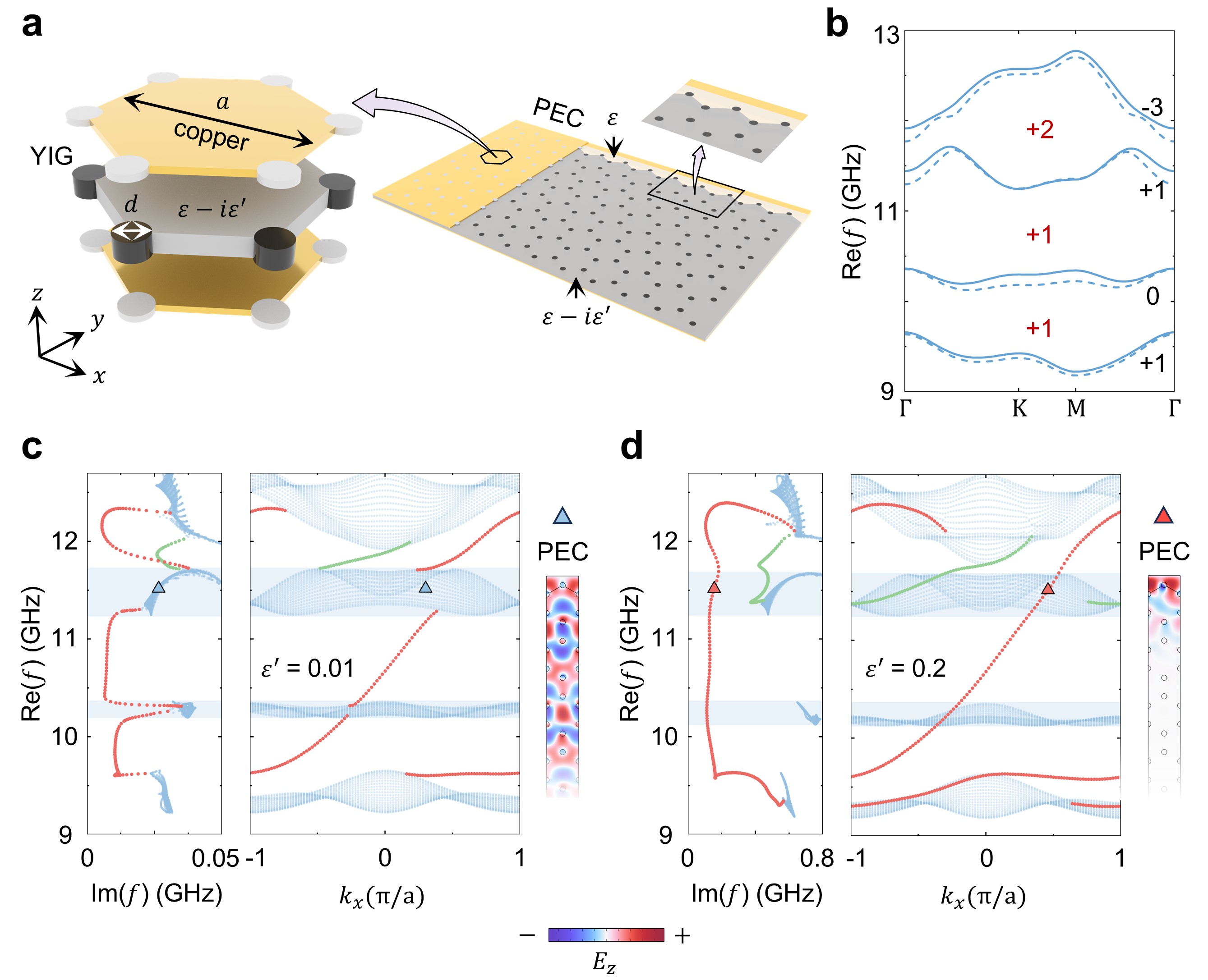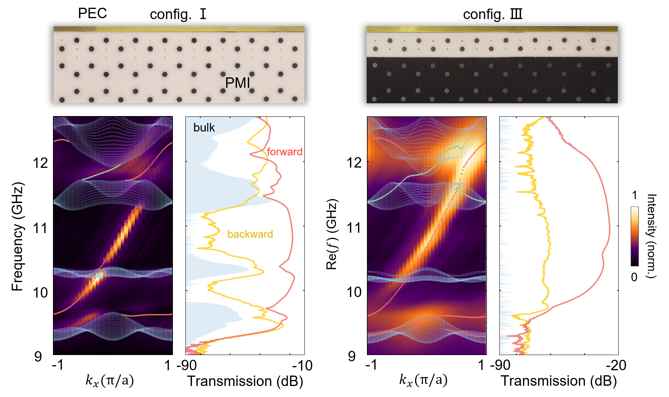 团队设计制备了具有多个非平庸拓扑带隙的二维旋磁光子晶体系统,通过调节体区域的介电常数虚部控制体态的损耗,实现手性边界态与体态的分离。具体表现为一条因损耗而展宽的手性边界态跨越了两条体能带和三个带隙,该边界态即使是在与体带重合的实频率范围内,仍然保持了很好的边界局域性(图2)。区别于周期边界与开边界条件不同所带来的非厄米趋肤效应(non-Hermitian skin effect, NHSE),这里的投影布洛赫波矢kx始终是一个好量子数。