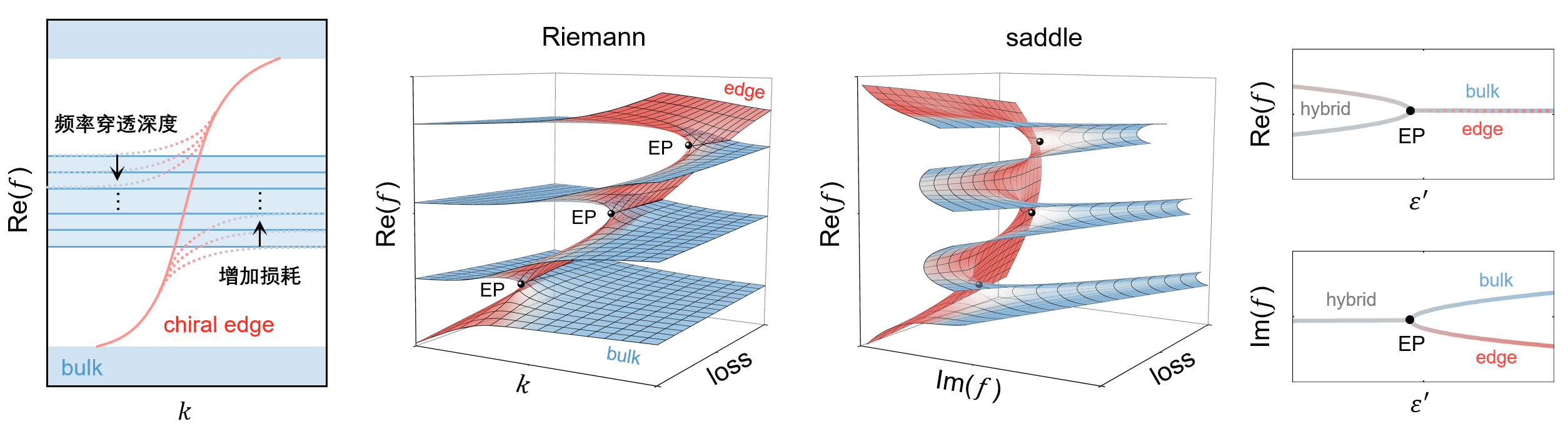 实验上进一步发现,在体-边分离过程中,随着体损耗的增加,一系列由手性边界态和投影体能带构成的奇异点分布在不同的动量点上,可被逐个点亮,使得精准调控边界态在动量空间中进入体态的“频率穿透深度”成为可能(图3)。其物理机制可归因于复平面中的边界态和体态在一个四维流形[实频率、虚频率、损耗、布洛赫波矢k]上的演化,其三维投影表现为典型的黎曼面和马鞍面。在特定方向上,这里的损耗与布洛赫波矢k可自然满足形成二阶非厄米奇异点所需的二维余维条件,使得精心设计和精准调控相同模式耦合与损耗/增益,实现超宽带手性边界态成为可能。