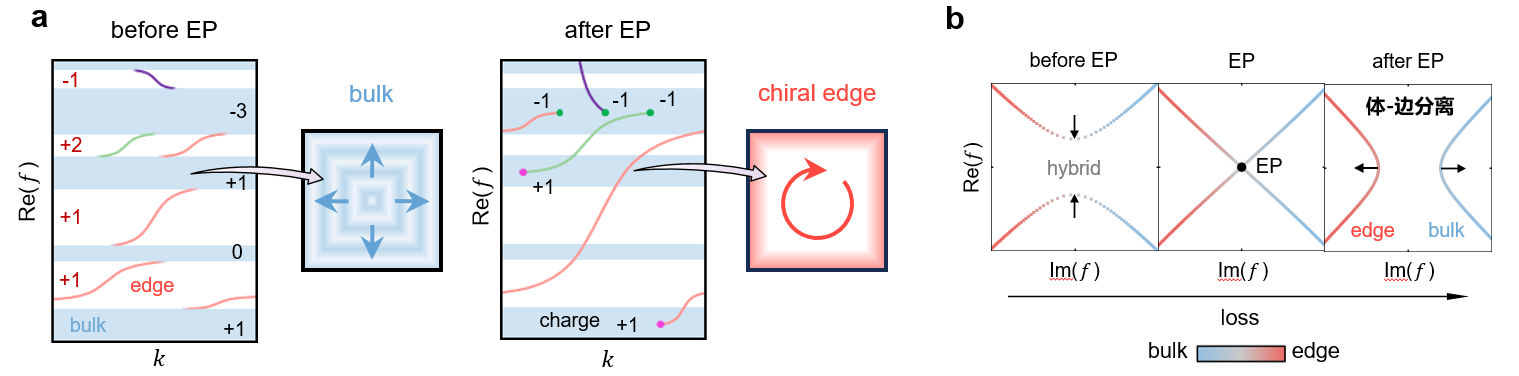 图1 (a)非厄米奇异点前后的手性拓扑边界态演化。(b)复平面上的“体-边分离”效应。