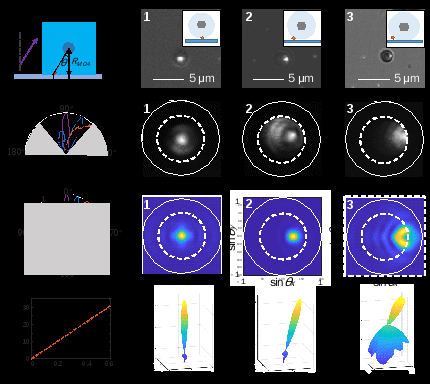 图2.光学天线位置与辐射方向的磁调控。(a) 天线-光源相对位置Δx由磁场方向θ决定。(b1-b3)不同天线位置下的荧光图像。(c)为b所对应的辐射角分布(X-Z平面)。(d1-d3) 分别对应b1-b3的后焦平面像(即角分布像)。 (e)Δx = 0, 0.3, 0.6μm时X-Z面内的模拟辐射角分布。(f1-f3) 为e图所相对应模拟二维角分布。(g) 光束方向与Δx呈线性关系。(h) 为f1-f3中相应的三维辐射图案。