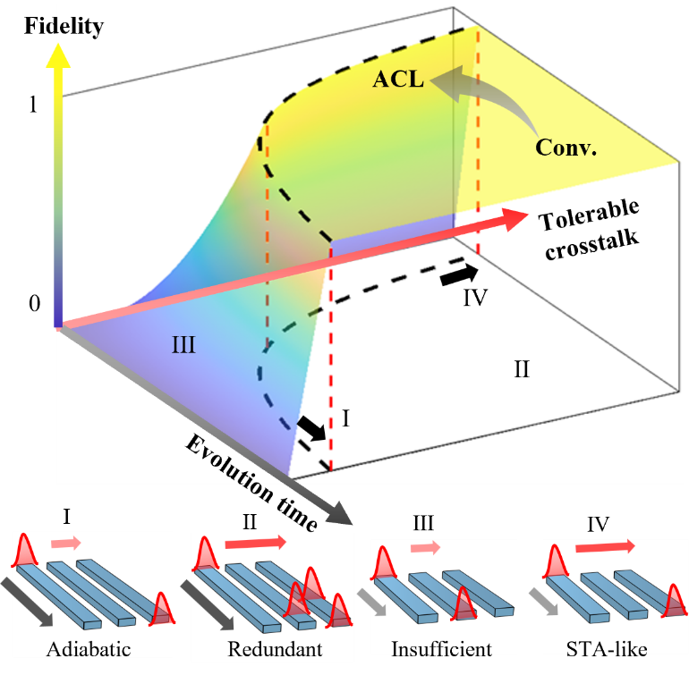 逆向设计原理如图1所示:演化目标由输出态与目标态的保真度量化,其受演化时长与模式串扰共同制约。传统方法因无法定量调控串扰难以平衡二者,而逆向设计通过全局优化时长-串扰参数组合下的最大保真度,揭示了四类演化模式:绝热演化、冗余演化、演化不足及类STA演化。当保真度趋近于1时,系统抵达ACL——此时演化以最短时长与最小串扰无冗余抵达目标态。传统设计常陷入冗余演化,逆向设计则突破该限制,开辟了高效鲁棒态调控的新路径。
