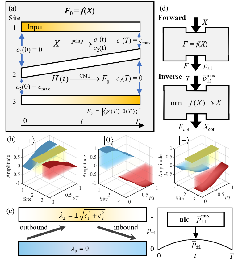 图2 STIRAP中的逆向设计原理。(a) 光波导中实现能量转移的函数框架。(b) STIRAP过程模式分布变化的示意图。(c) 左:本征态布居数演化;右:约束平均串扰的非线性条件。(d) 正向设计与逆向设计对比:正向设计直接输出结果,逆向设计在给定的参数约束下求最优解。