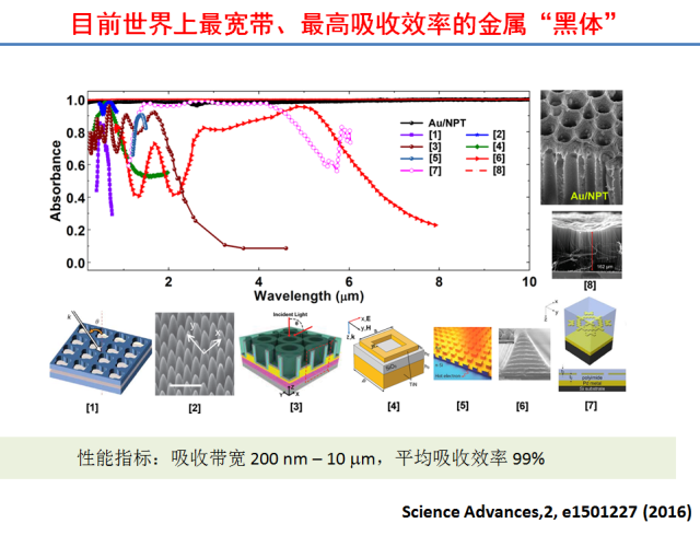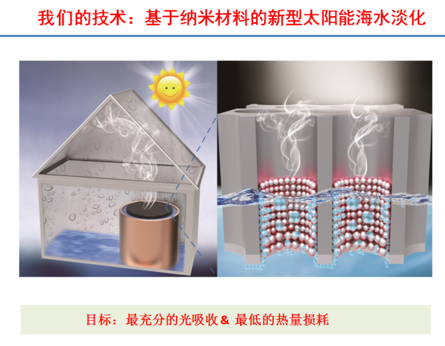 目前传统的海水淡化装置消耗大量热能或电能,碳排放量大、装置体积庞大,且淡化效率、效果均有待提高。利用太阳能光蒸馏的海水淡化技术低碳环保,然而多年来一直受限于较低的光热转换效率(~30-45%)而无法大规模应用。该作品的核心部件是基于微纳结构的金属吸收体,具有宽太阳光谱超高光吸收效率,使海水淡化过程中光热转换效率大大提高;多孔薄膜结构使得器件自身可漂浮于海面上;而金或铝纳米颗粒的局部等离激元光学共振效应所产生的局部温度增强,使该产品在应用时将热能集中于加热表层海水,大大降低了能耗;吸收体的制备采用简单可规模化生产的自组装技术,对产品的实际应用也具有重要的意义。相关研究成果已经引起中石化等企业的关注,下一代基于碳结构的吸收体材料也已处在研发进程中。