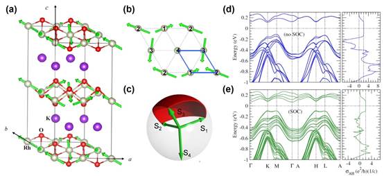 KxRhO2是一个由RhO2层和K层交替排列形成的层状材料(图2(a)),其中RhO2层形成二维的三角晶格。当x=0.5时,我们通过计算并比较了大量不同磁结构的能量,发现该材料具有一个特别的磁基态:全出/全进的非共面反铁磁(图2(a)和(b)),该磁结构元胞为晶体学元胞的4倍(