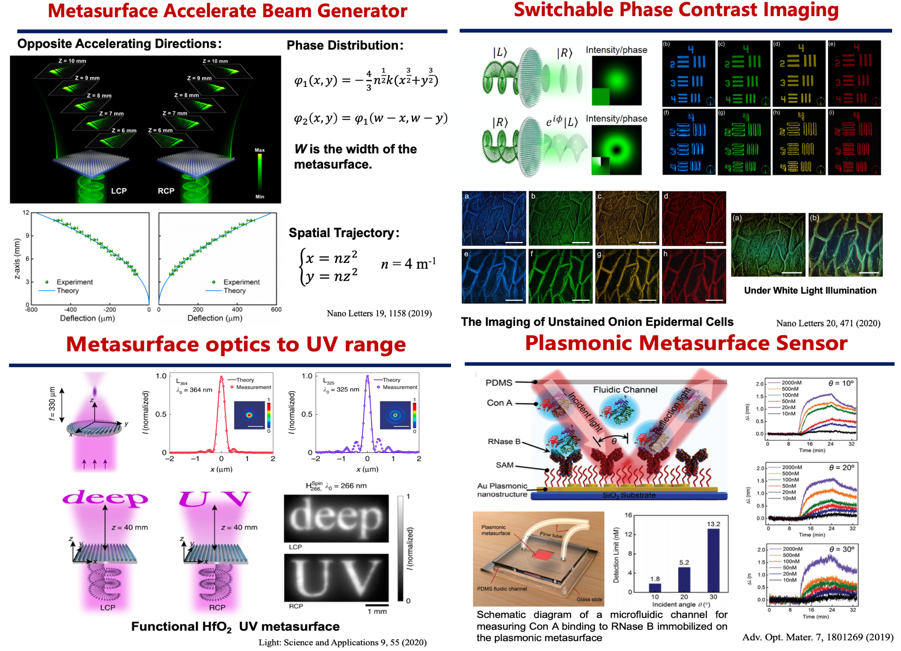 除了三维光学超构材料,徐挺教授还介绍了多项关于二维平面超构材料(超构表面)的研究成果。课题组利用亚波长平面微纳结构对入射光场相位的有效调控,设计制备了多种微纳光学功能器件,包括空间加速光束的产生与控制,高分辨螺旋相差成像系统、紫外频段的偏振可控全息以及基于等离激元共振原理的高灵敏度生化传感系统。最后,徐挺教授总结展望了光学超构材料的未来方向。