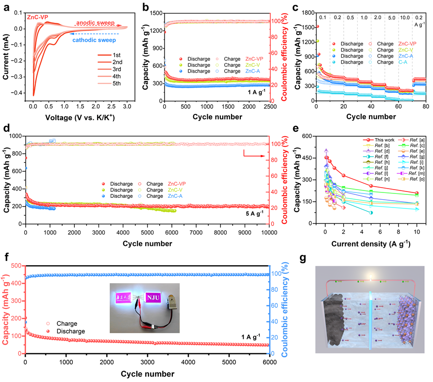 图4. 钾离子电池性能。(a)碳负极CV曲线。(b)碳负极在1A/ g的循环性能。(c)碳负极倍率性能。(d)碳负极在5A/g的循环性能。(e)碳负极性能汇总。(f)全电池性能。(g)全电池示意图。