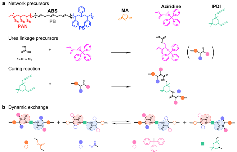图1. ABS-V的合成示意图。(a)合成化学。(b)基于受阻脲键的可逆动态交联。