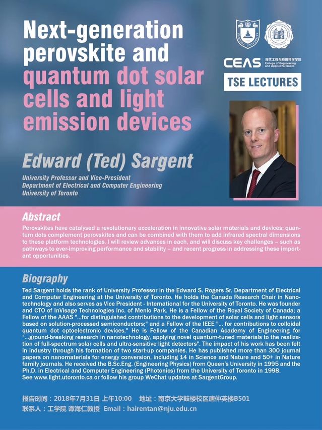 我们有幸邀请到多伦多大学 Prof. Edward Sargent,作为TSE Lectures系列讲座的第四讲嘉宾。报告信息见下,欢迎各位老师和同学参加!