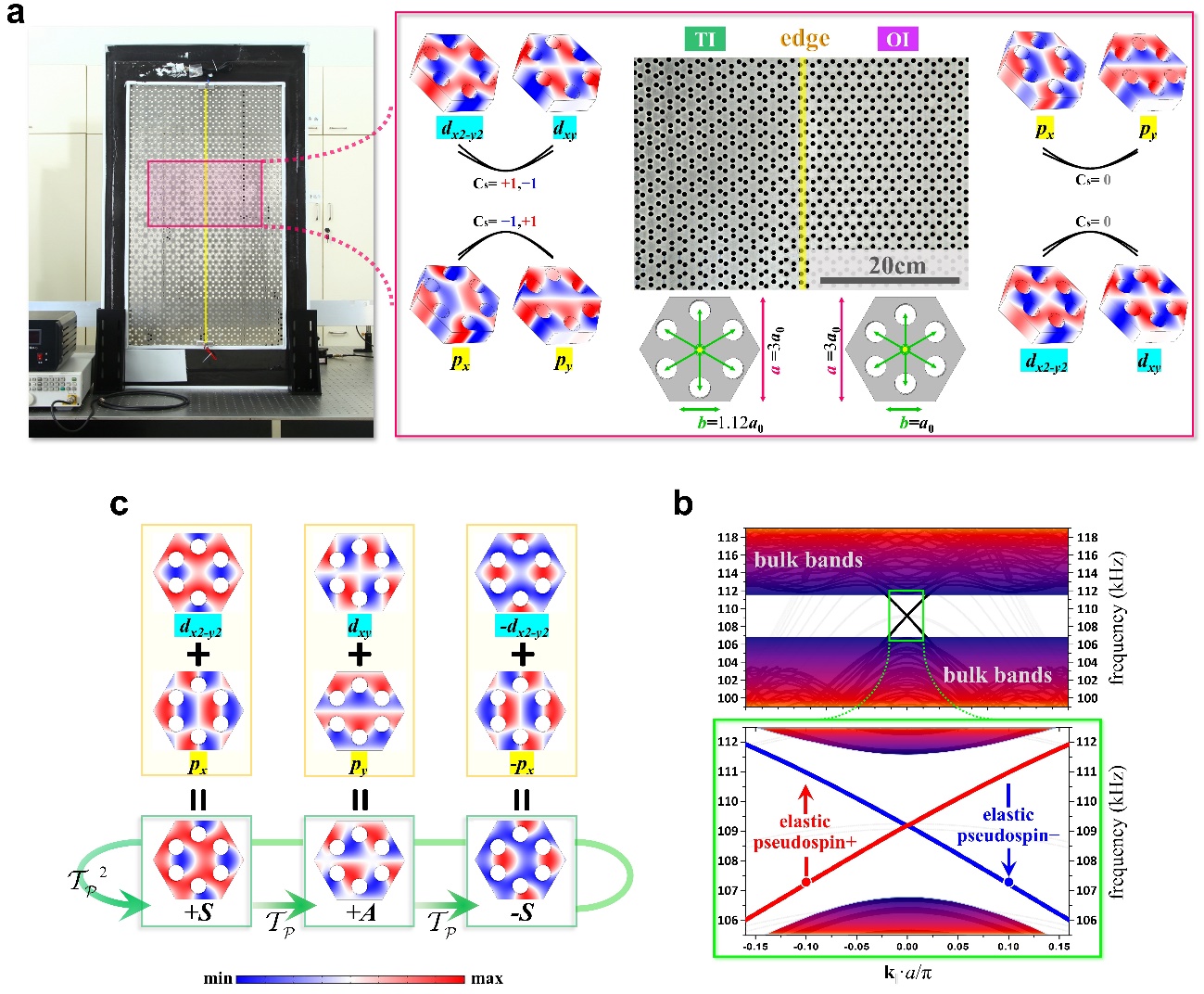 图2,固体声波(弹性波)的赝自旋态的构建:a实验样品由两块固体“声绝缘体”拼接构成,左侧和右侧的“声绝缘体”禁带范围一致,但顶带和底带中的模式互为反转;它们的能带具有不同的拓扑不变量;b由四种简并态构建的赝自旋基矢(S与A);c拓扑边界态的投影能带:在禁带中存在两条无能隙且具有“自旋-动量锁定”特征的边界模式。